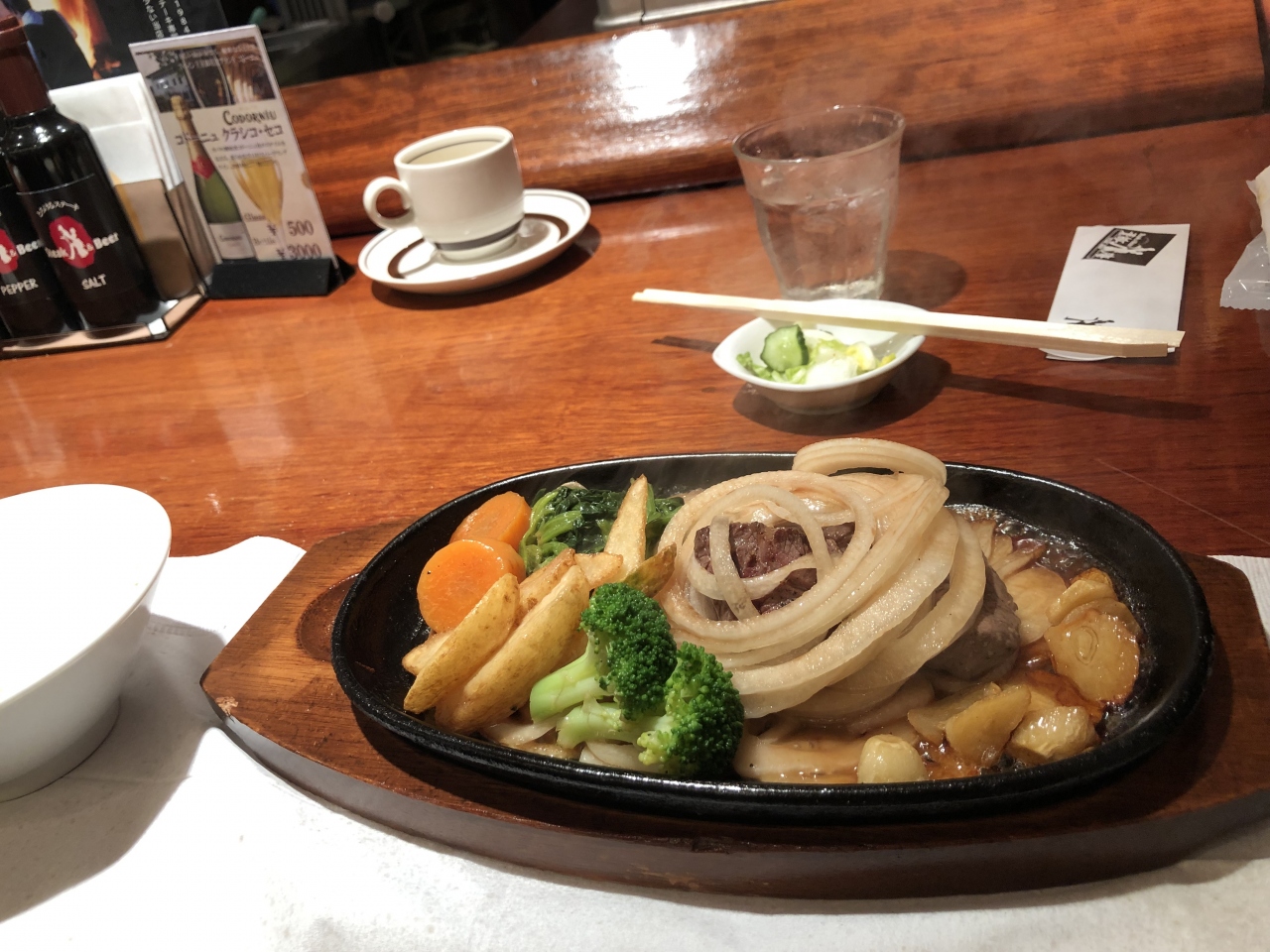 銀座でお肉が食べたくて訪問しました。銀座インズの地下1階にあります。お昼時に行ったので満席で、少し待ちました。その間も「もうすぐカウンター空きますから」等とこえをかけて頂きました。ランチステーキは980円。ごはん、スープ、漬物、一口ステーキ、付け合わせは、玉ねぎ、ホクホクのガーリック、ほうれん草、ブロッコリー、人参。