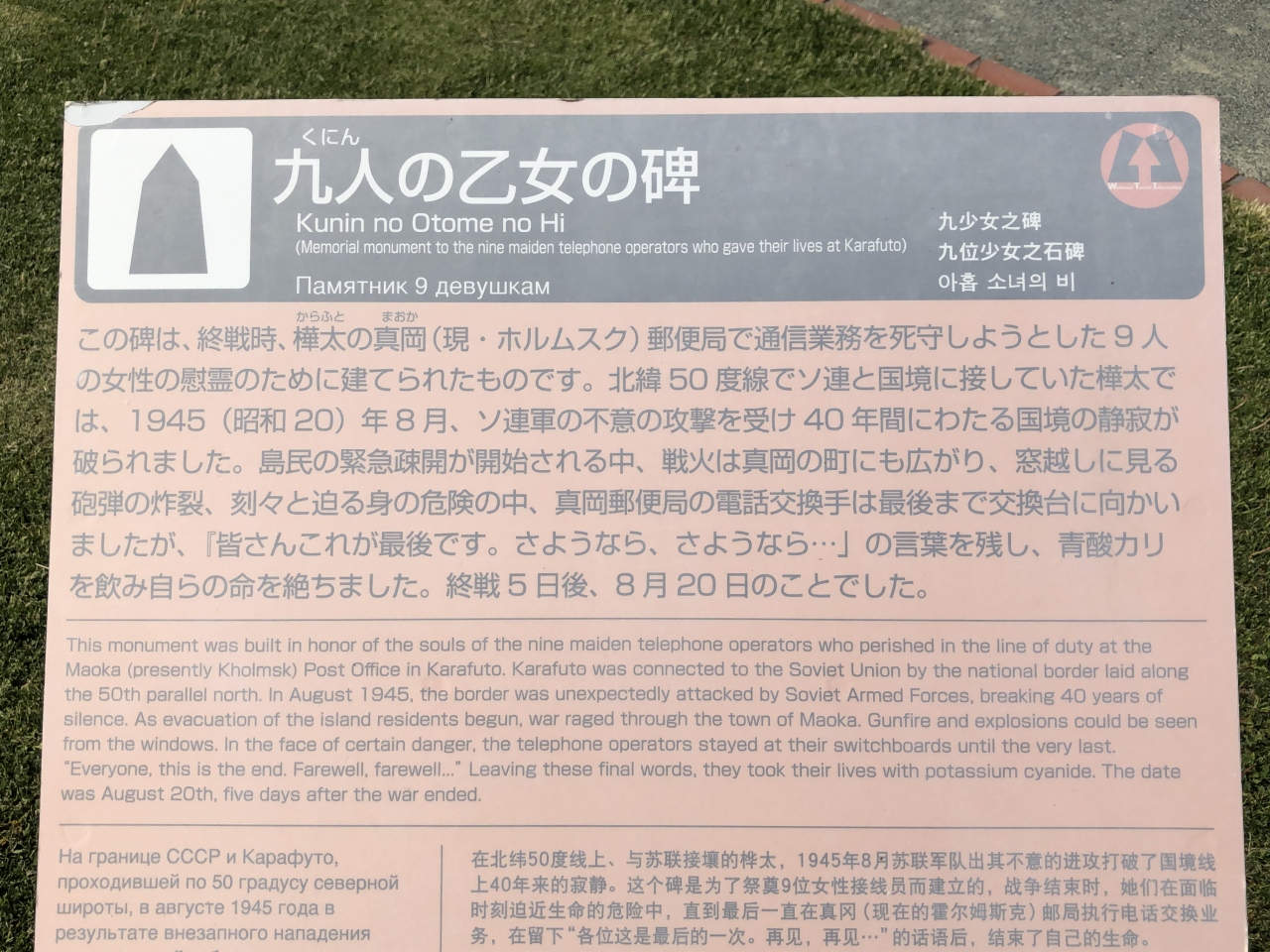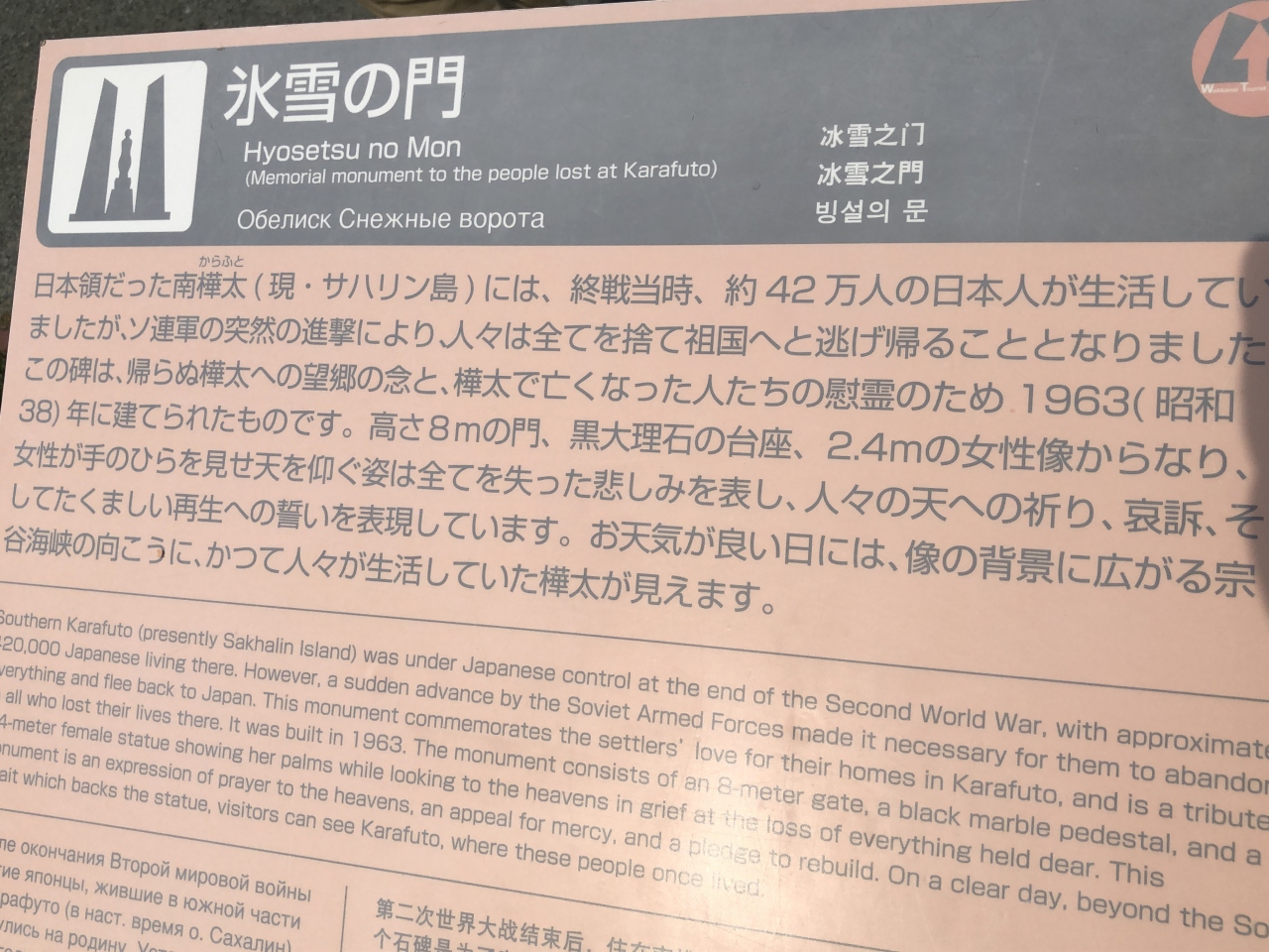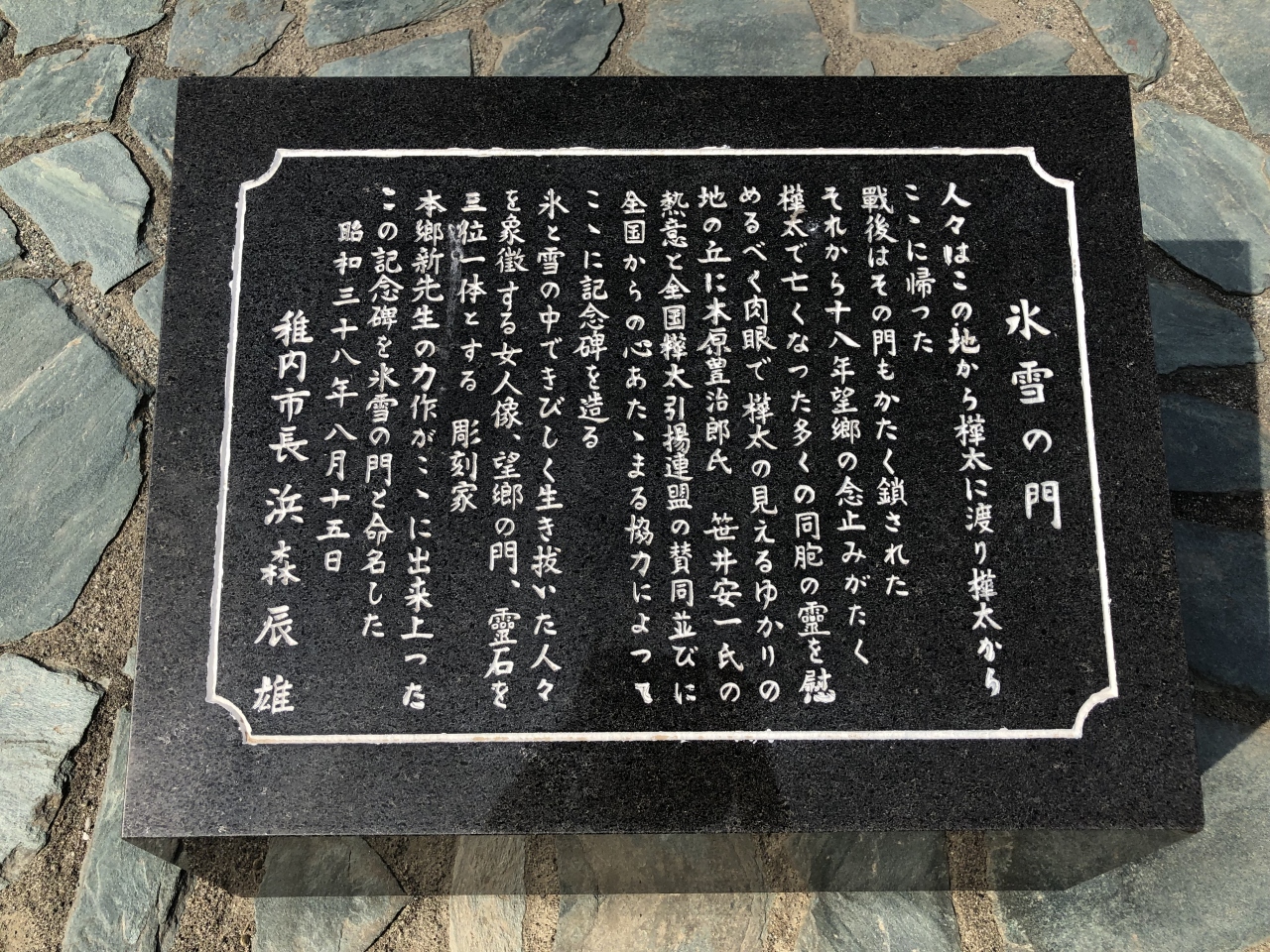 ツアーで稚内公園に行きました。「氷雪の門」「9人の乙女の碑」などと並んでこの碑があります。「9人の乙女の碑」の背景をバスガイドさんに聞き、感銘を受けました。昭和天皇も背景をお聞きになって、感銘を受け、謳われたようです。