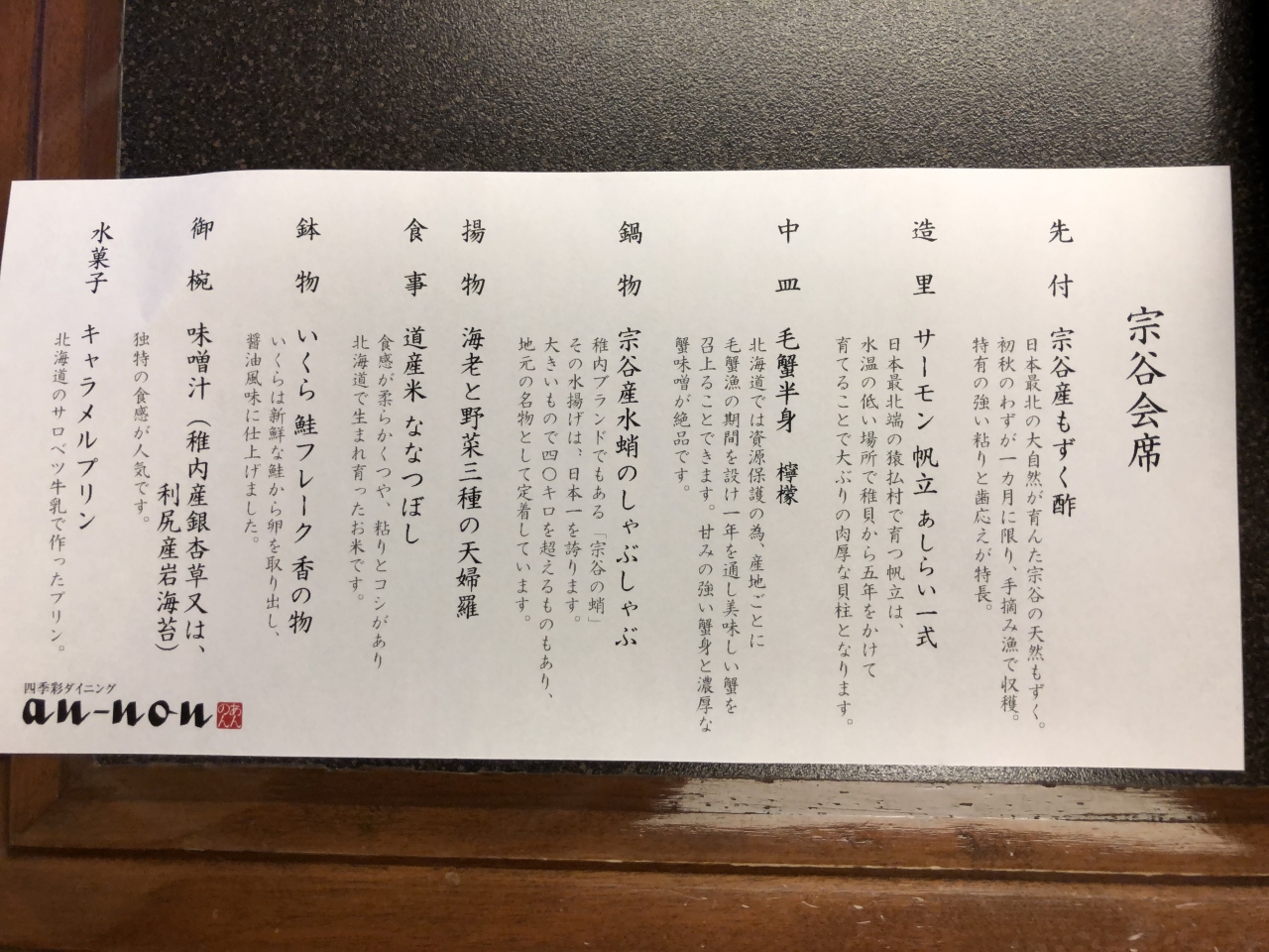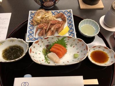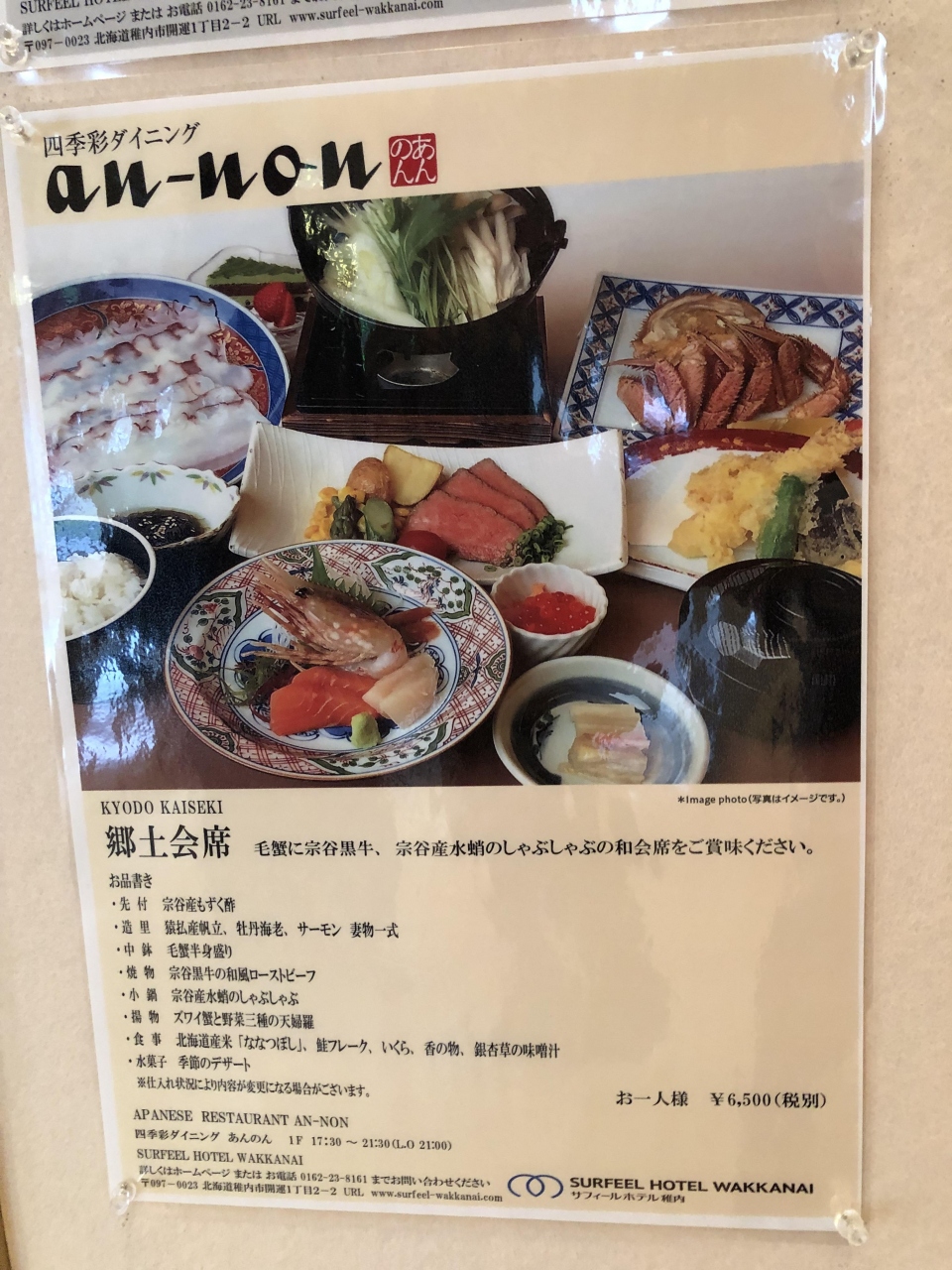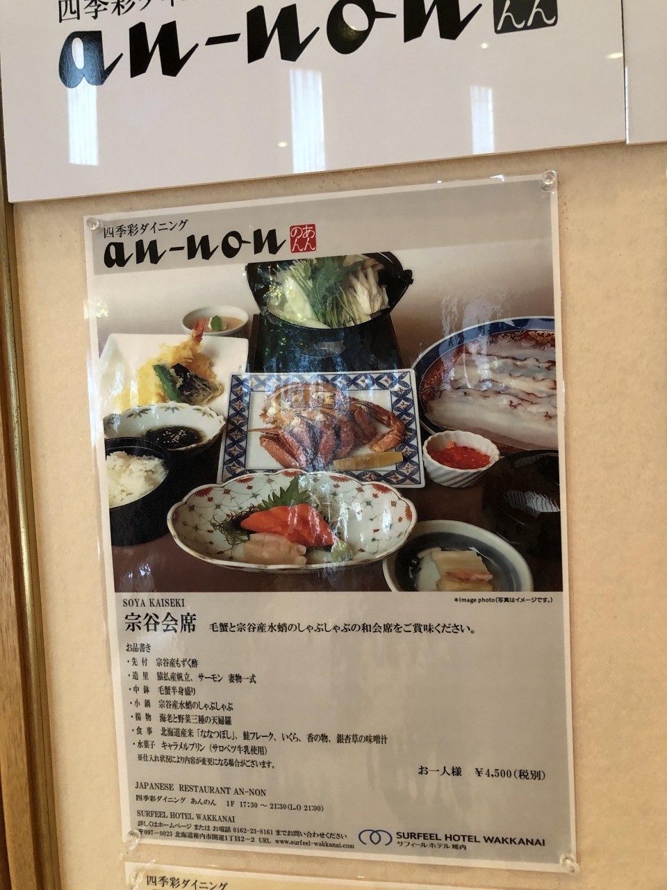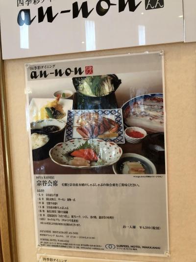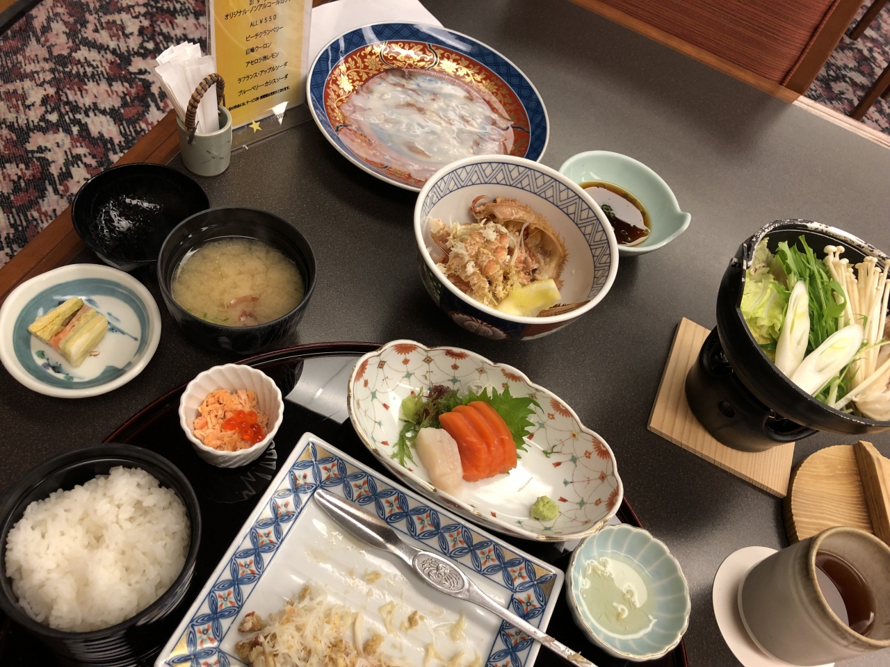 ツアーの夕食が、この宗谷会席か、洋食・中華のブッフェかの2択だったので、こちらの宗谷会席をチョイス。モズク、鮭とホタテの刺身、毛ガニ、天ぷら、水タコのしゃぶしゃぶ、ご飯とみそ汁と漬物、キャラメルプリン。4500円。美味しかったです。