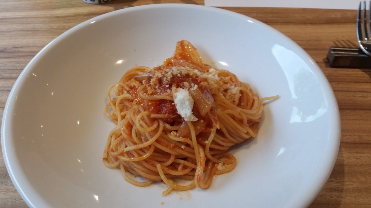 新聞屋さんからチケットを貰ったので、友達と待ち合わせし、国立新美術館で「トルコ至宝展」を鑑賞しました。美しいものを見て、心が満たされた後は、お腹を満たそうと、地下のここに来ました。カフェテリア形式で、自分でお盆に欲しいものを乗せ、後払いするシステム。スパゲティーが950円で、おいしかったです。