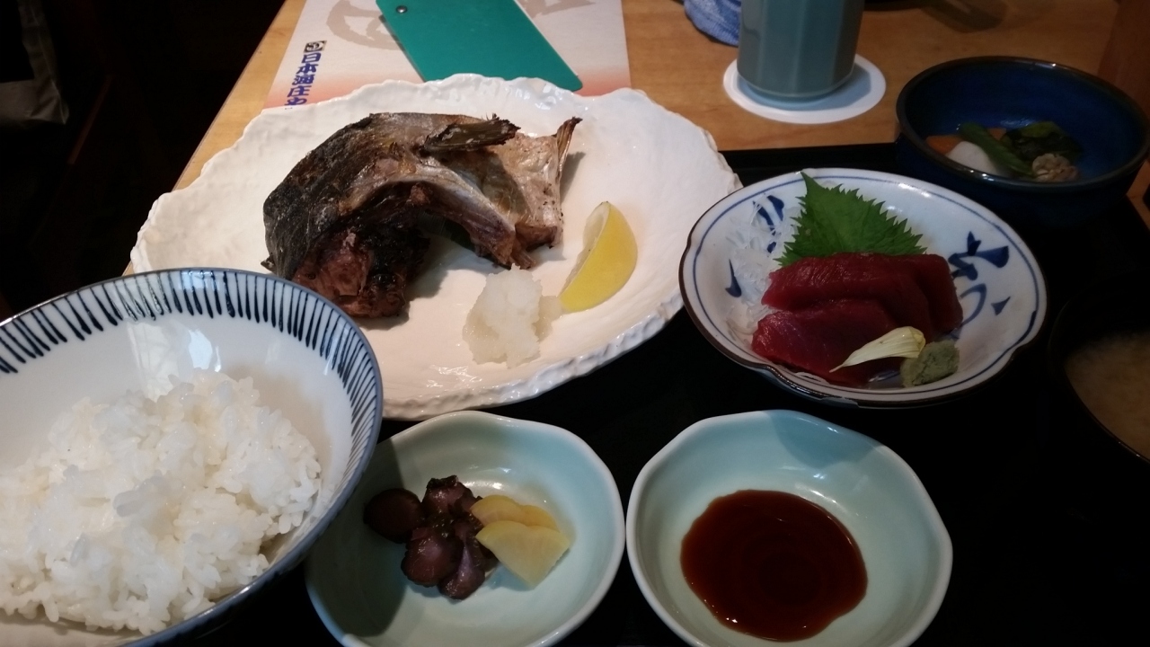 JR津田沼駅直結の津田沼パルコ6階にあります。今回は日替わりの焼き魚定食「ブリかま」をオーダー。魚の種類は毎日変わります。ごはん、みそ汁、漬物、カボチャと貝と里芋の煮物、マグロの刺身が付いて950円。美味しいです。