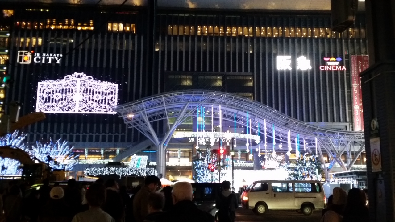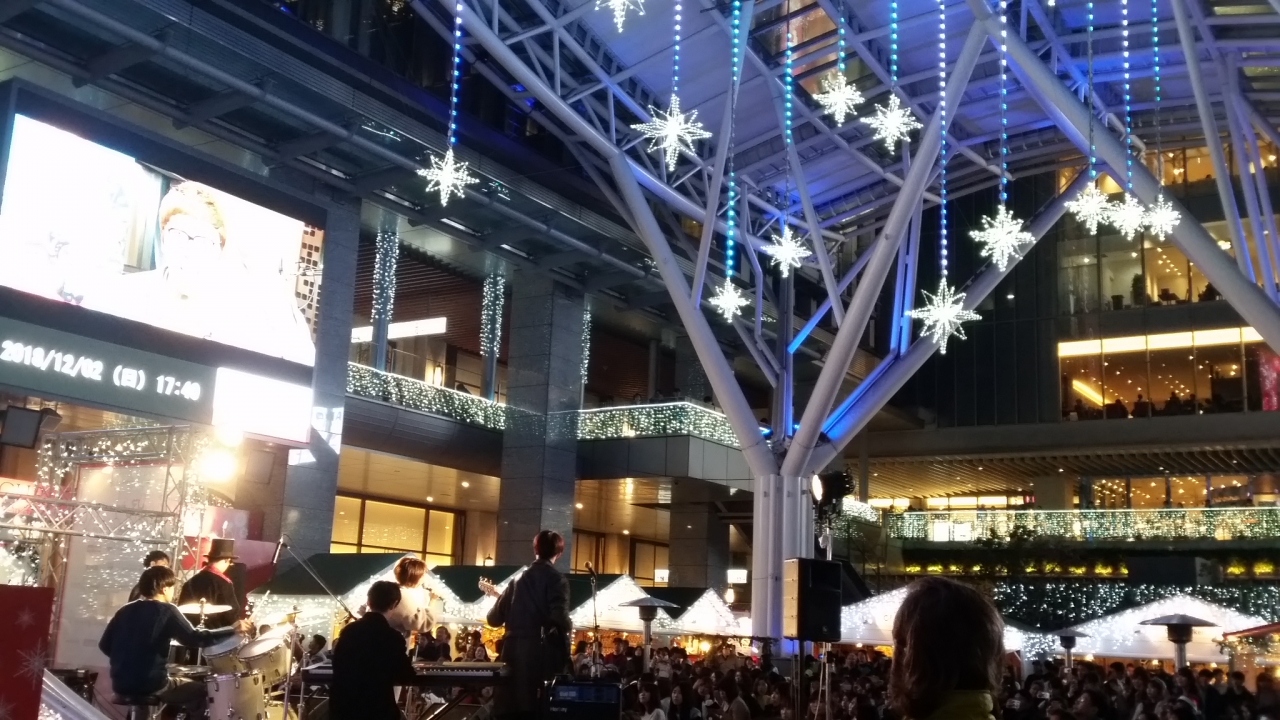 JR博多駅の冬の風物詩です。イルミネーションが美しく、多くの観光客が写真を撮っています。日曜は生演奏が行われており、毎年違った模様のカップが売られ、ワイン、スパイスの飾りのお店などが出ています。賑わっています。