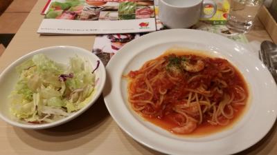 新橋駅から徒歩5分のホテルの2階のファミリーレストランです。久しぶりに行ったら内装が変わり、一人席が増えていました。注文してから出て来るまでが早い。そして安い。スープとサラダと、エビ入りトマトソーススパゲティが647円でした。美味しかったです。