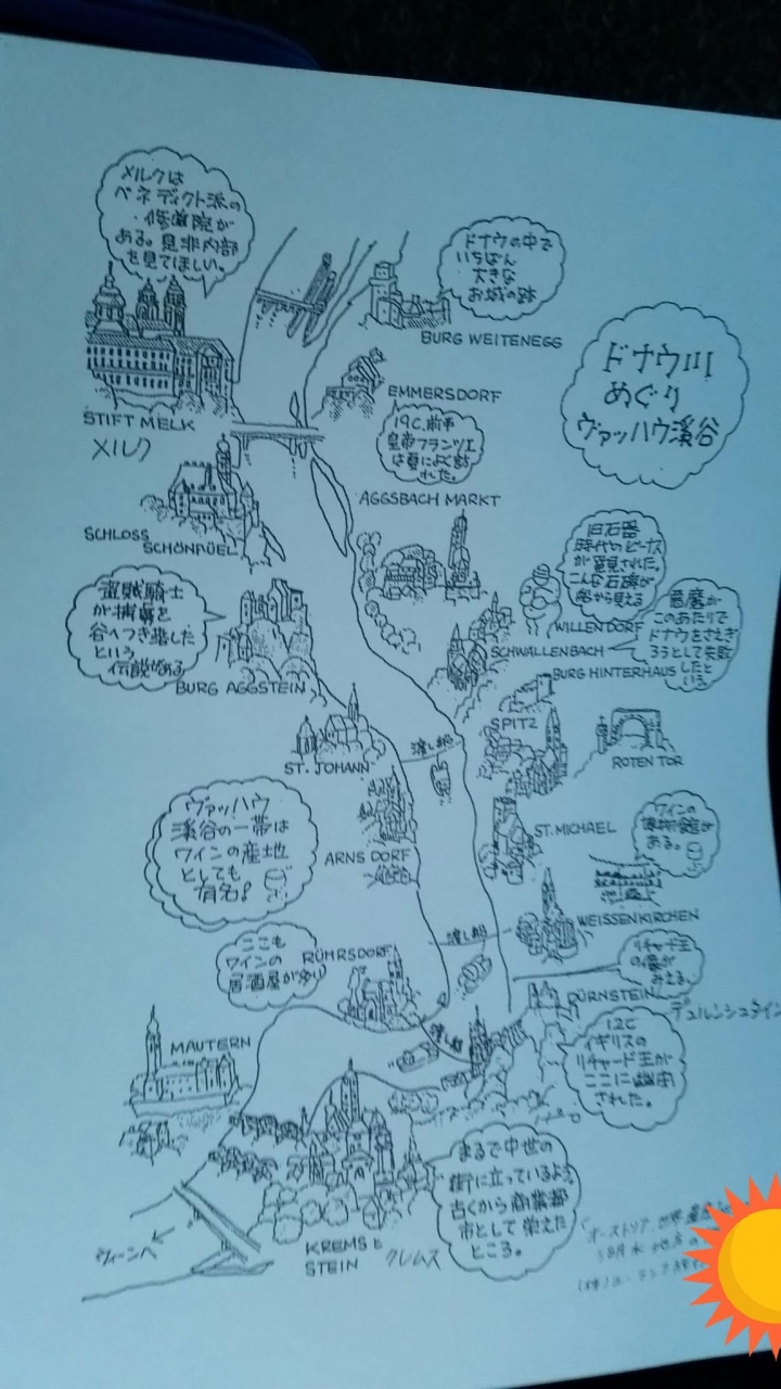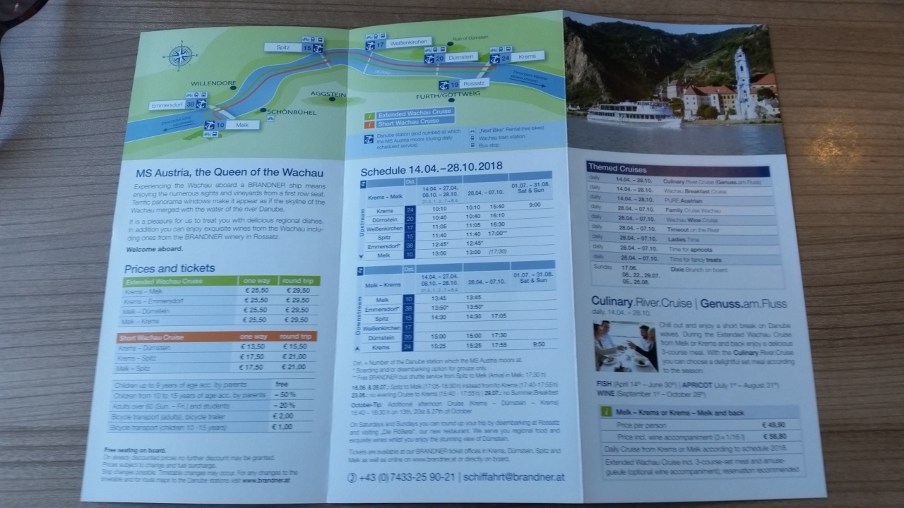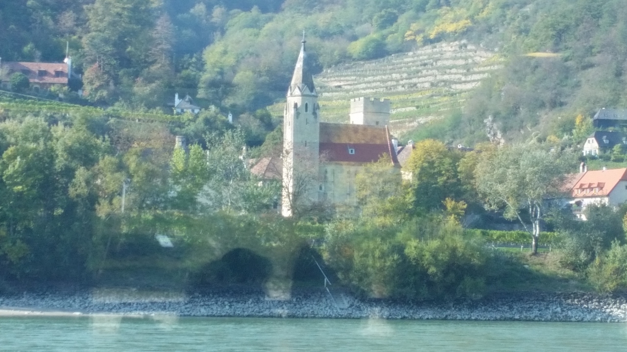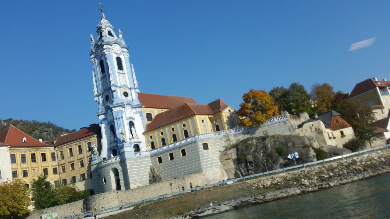 ツアーでドナウ川クルーズをしました。メルクからクレムスまで、ヴァッハウ渓谷の両岸には古城や小さな街が点在し、それを船に乗って、ゆったりと眺めることができます。座席はテーブル席は指定、デッキは自由席、飲み物などは有料。晴れて温かく、眺めも良く、幸せな気分になりました。