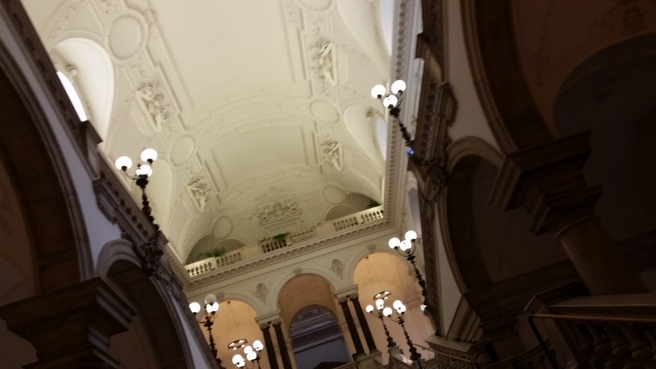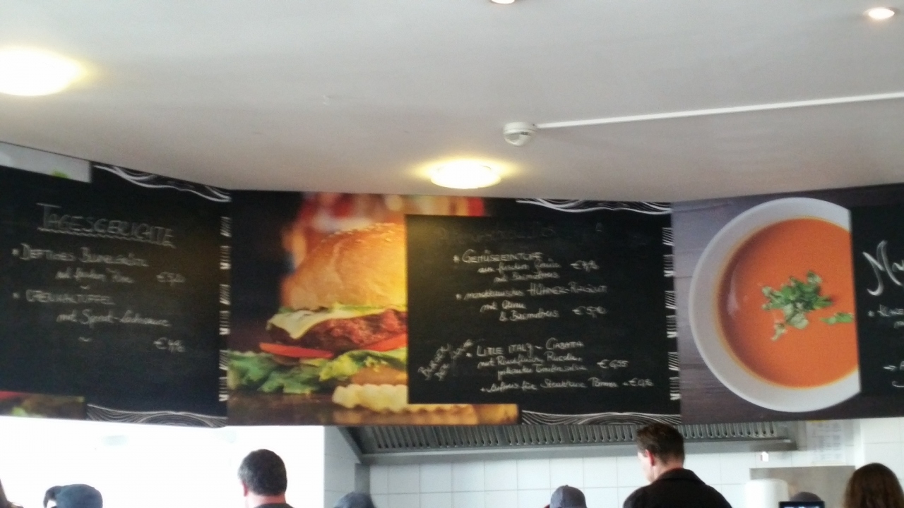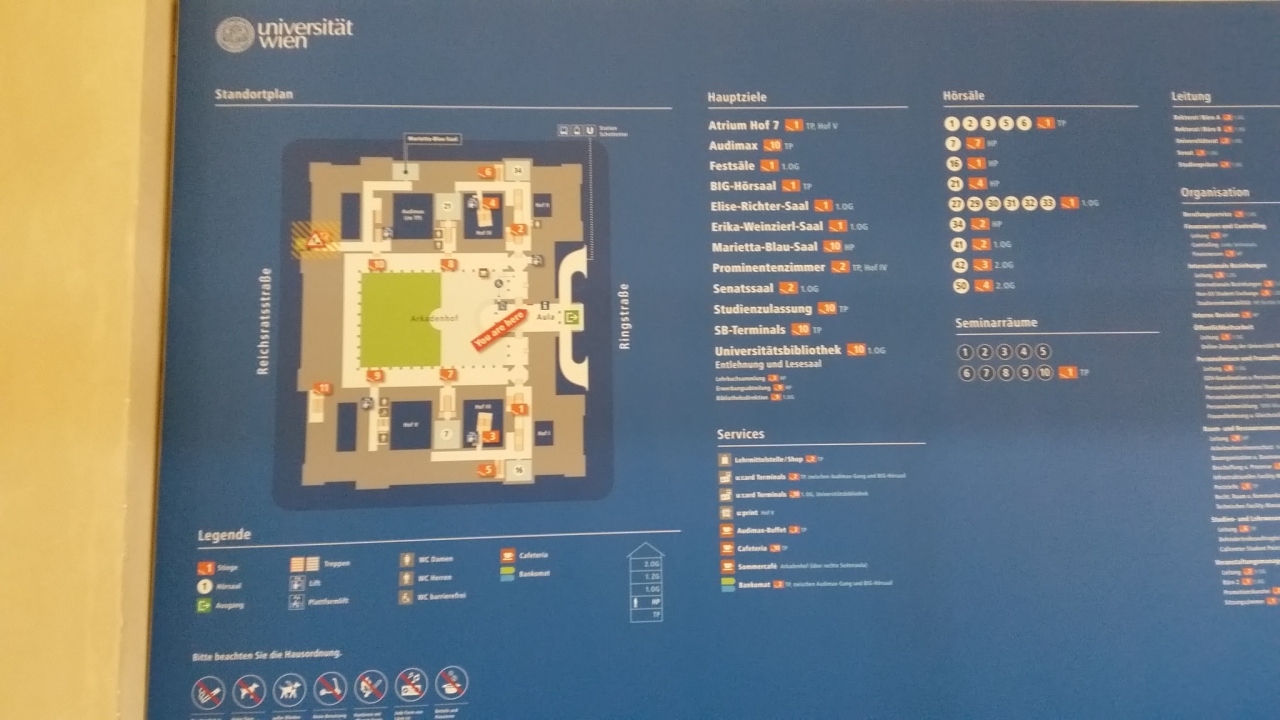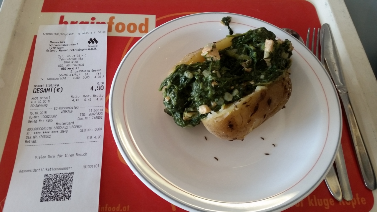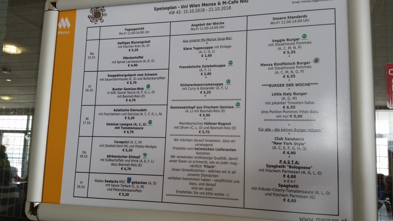 ウィーン大学の内部をさらっと見学し、売店を覗いてから、行きました。ウィーン大学から2ブロック先の新館7階にあり、学生や職員でなくても利用できます。ドイツ語が読めないし、見本も置いてなかったので、上から覗いて(背が届かず、見えなかった)掬い上げてもらってみて、指さして注文しカードで支払いました。栄養バランスは良いと思いました。