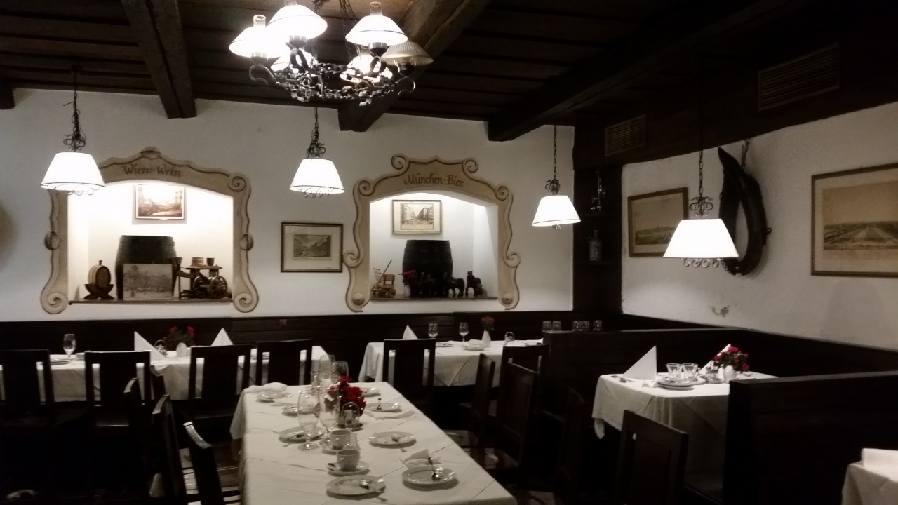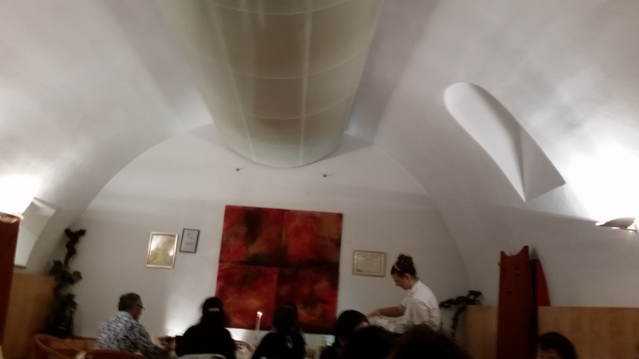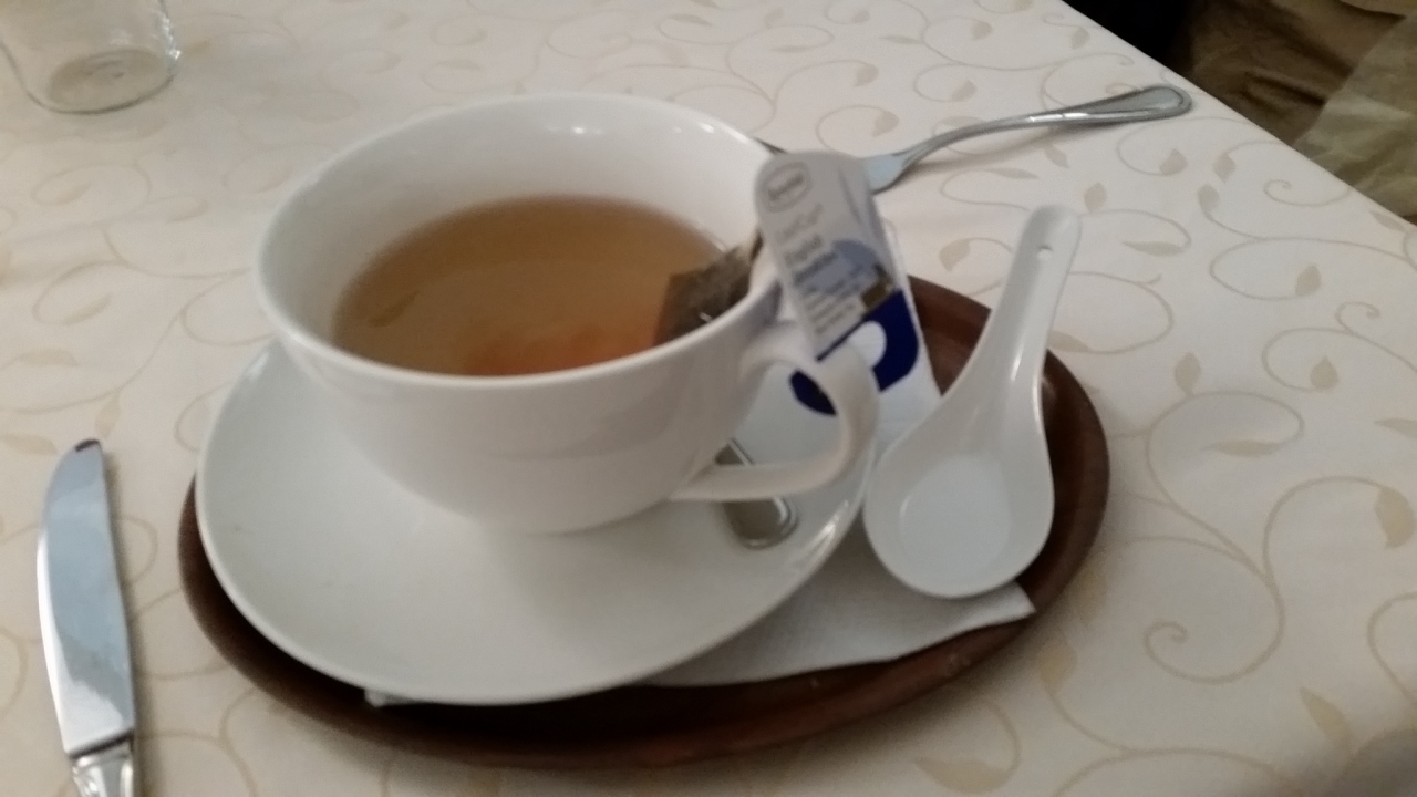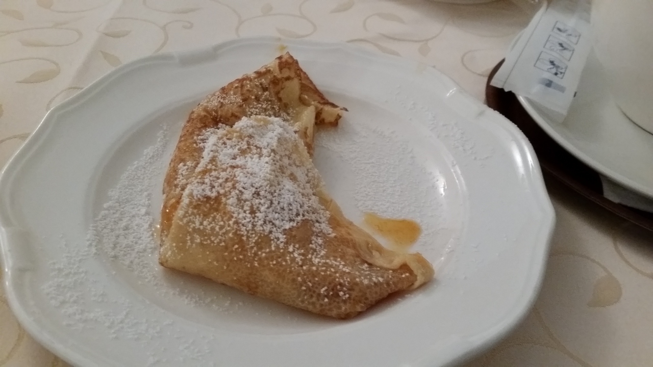 ツアーでランチに訪問しました。偶然街はお祭りで大混雑、サーブに時間がかかりました。メニューはシュー入りスープ、ウィンナシュニッツェル、クレープ。美味しかったです。紅茶は2.9ユーロ(386円)大きなカフェオレボールに入り、蓮華が添えられていました。