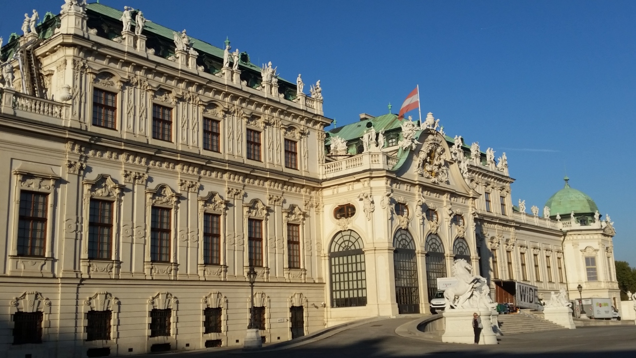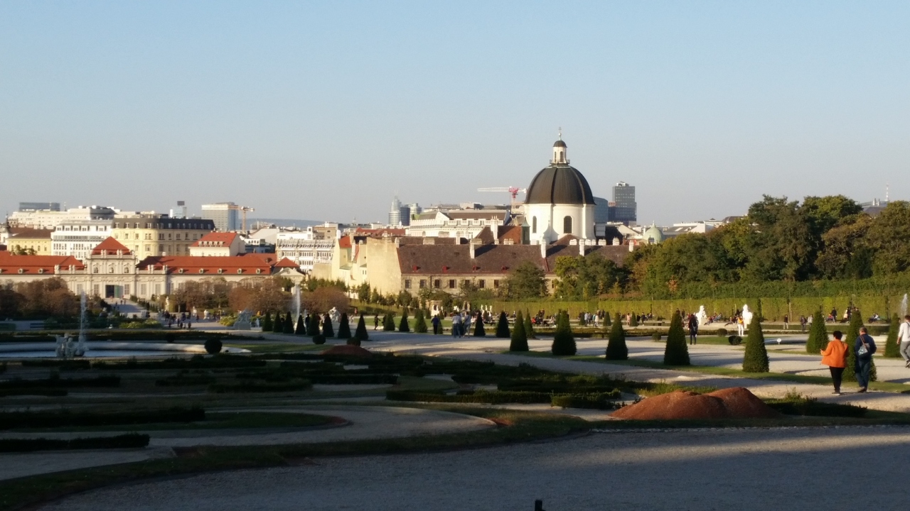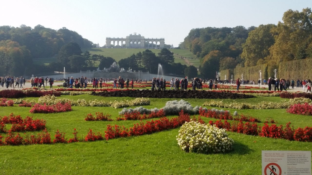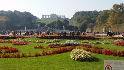 ツアーで訪問しました。シェーンブルンとは「美しい泉」との意味だそうです。宮殿はテレジアン・イエローと呼ばれるクリーム色、芝生は緑、裏庭には赤いベコニアなどが咲いています。その先には噴水奥の小高い丘にはグロリエッテ。広い広い庭が広がっていて美しいです。
