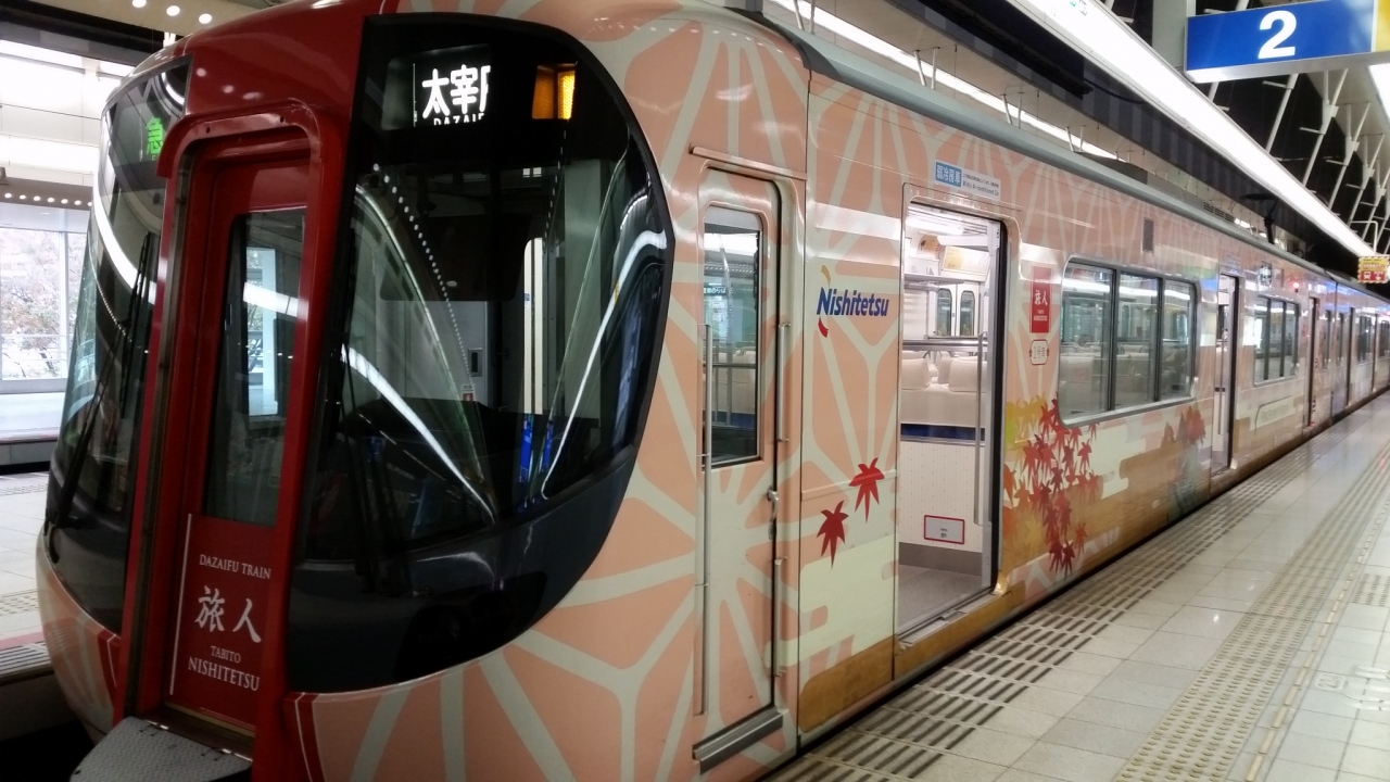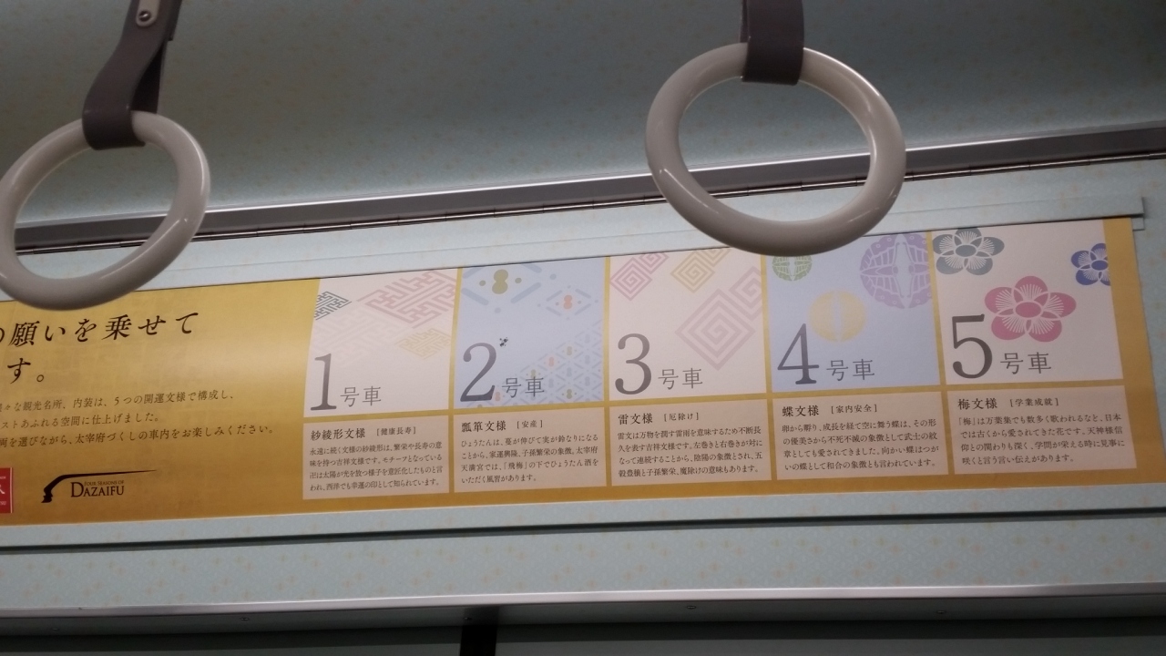 九州国立博物館へ行くために、天神から大宰府まで利用しました。偶然ちょうど良い列車が「旅人」でした。ラッピング列車です。各車両ごとにテーマがあり、私が乗ったのは「ひょうたん」縁起が良い物だそうです。面白いと思いました。