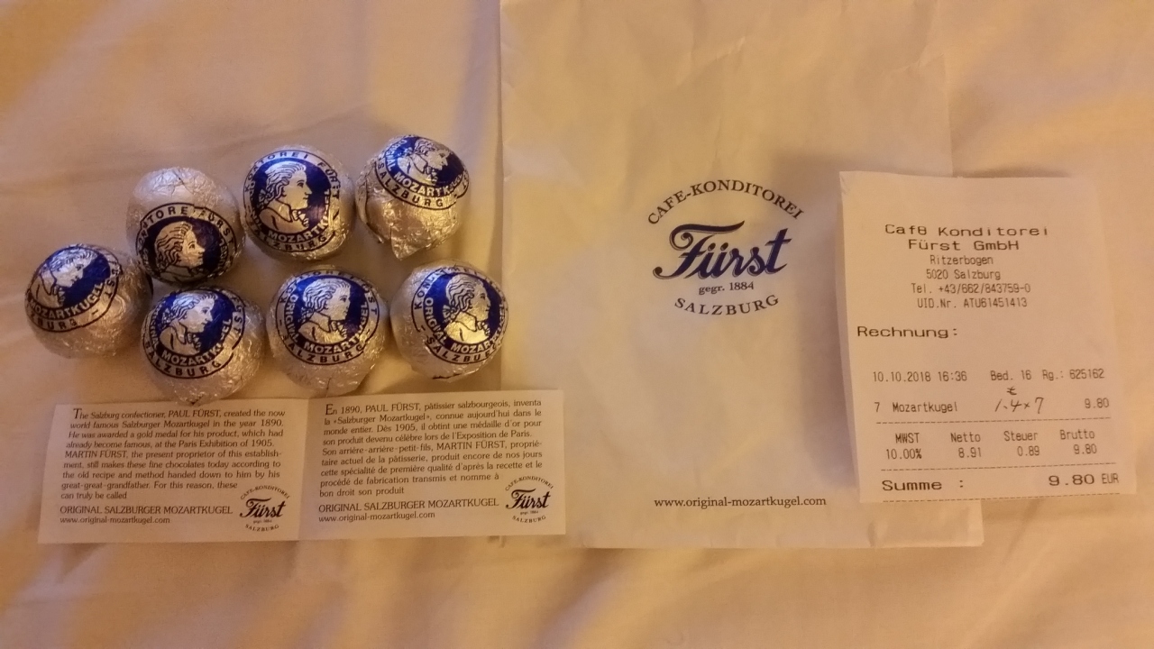 モーツアルト・クーゲルを生み出した老舗パティスリーです。テイクアウトや店内、テラス席でも味わえます。本店は混んでいたので、支店でクーゲルを7個買いました。1個1.4ユーロ(188円)とお高めの設定。紙袋を2枚頼むと、文句を言われ、1枚だけくれました。つっけんどんな態度で感じが悪かったです。他のツアー客も同様なことを感じたようです。甘すぎて私は日本のチョコの方が好きです。