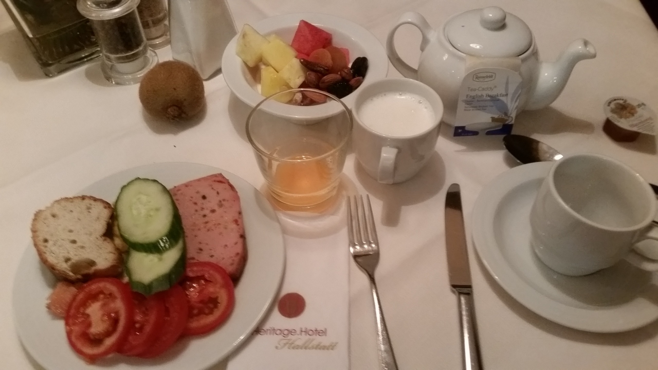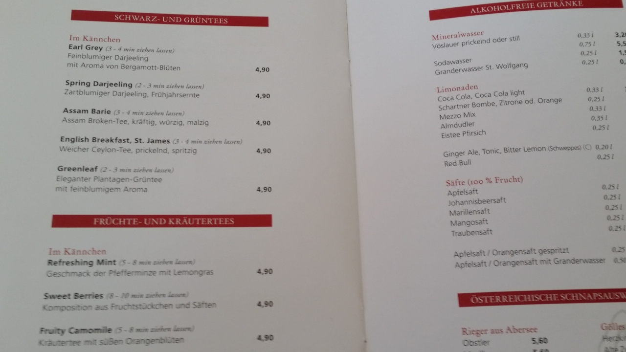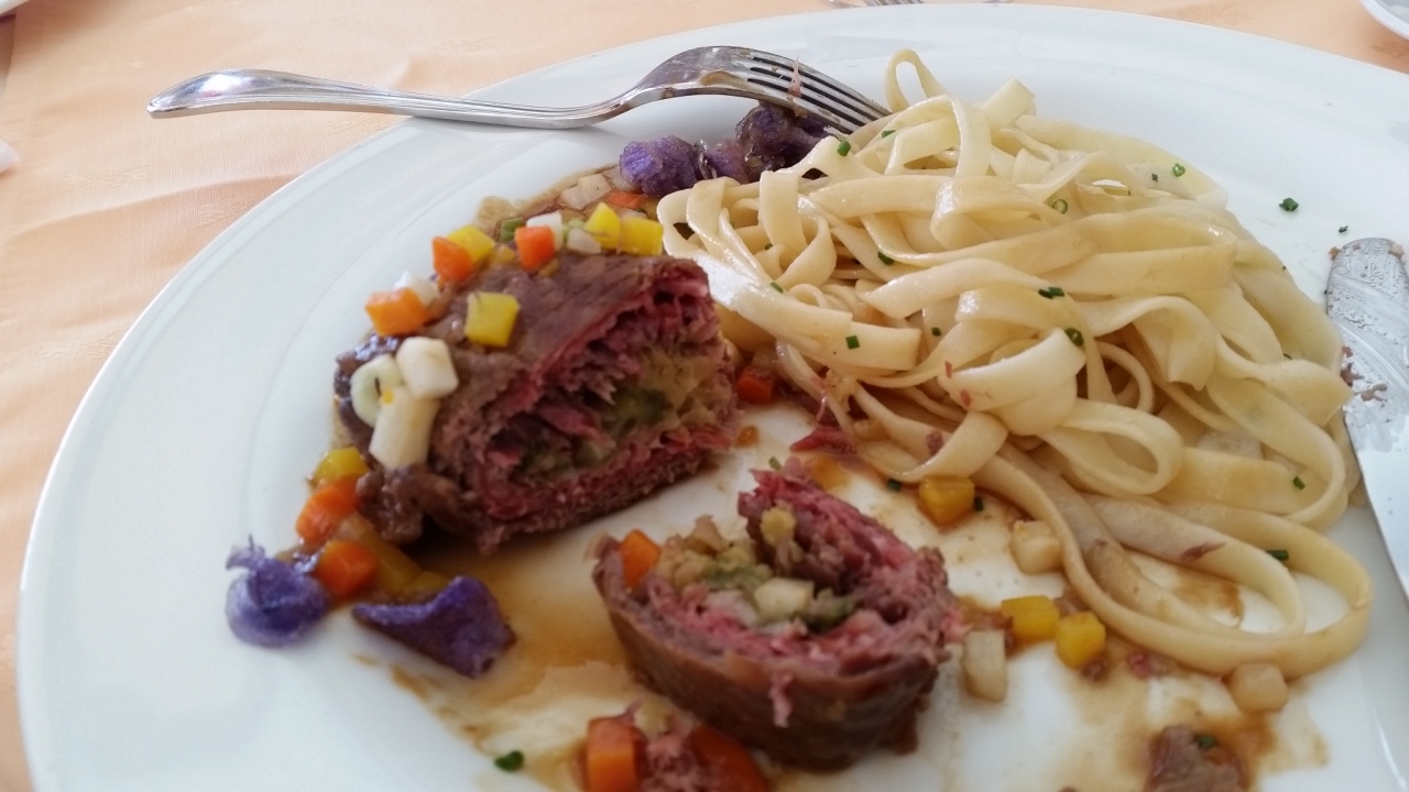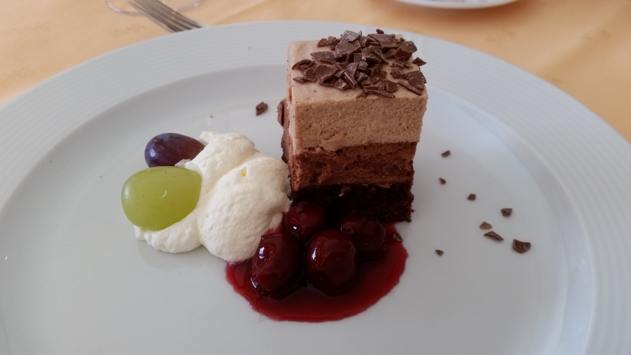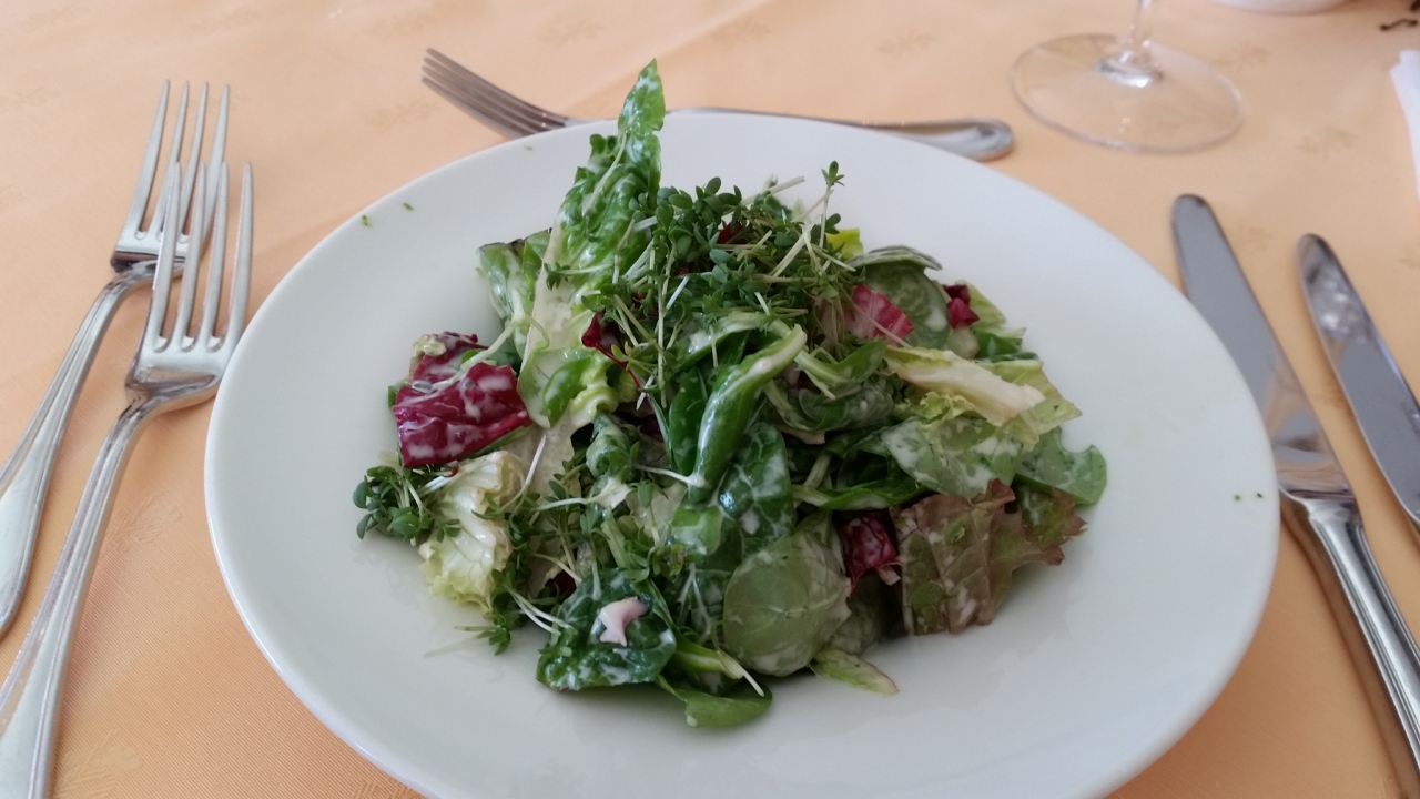ツアーランチで利用しました。オペレッタ「白馬亭にて」の舞台になったホテルのレストランです。メニューはフレッシュガーデンサラダ、ビーフロール、チョコケーキ。紅茶は数種類から選べ4.9ユーロ。湖の真横で、眺めがよく、美味しかったです。