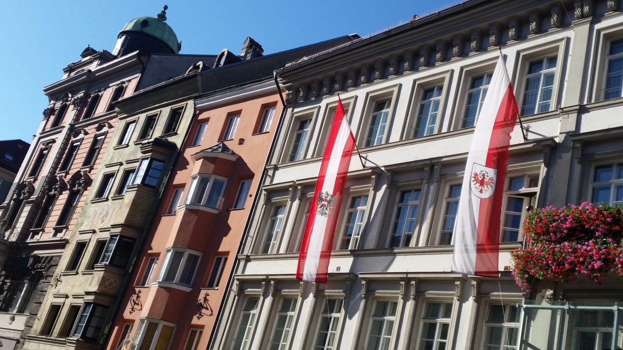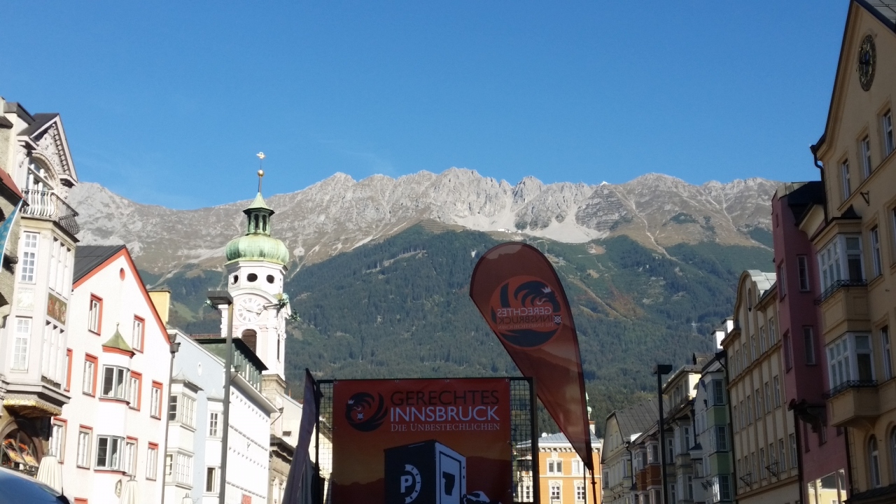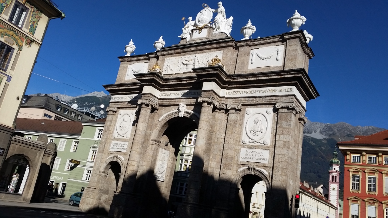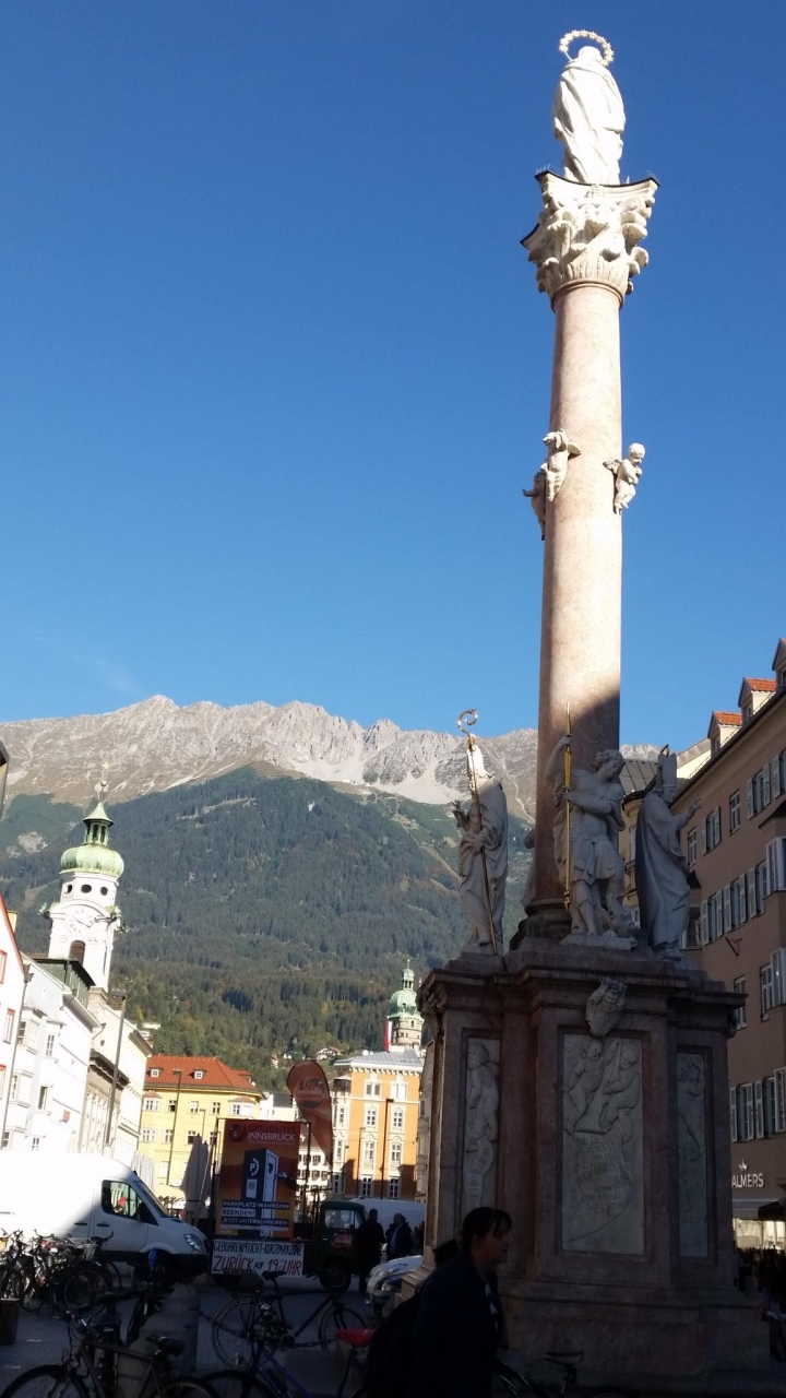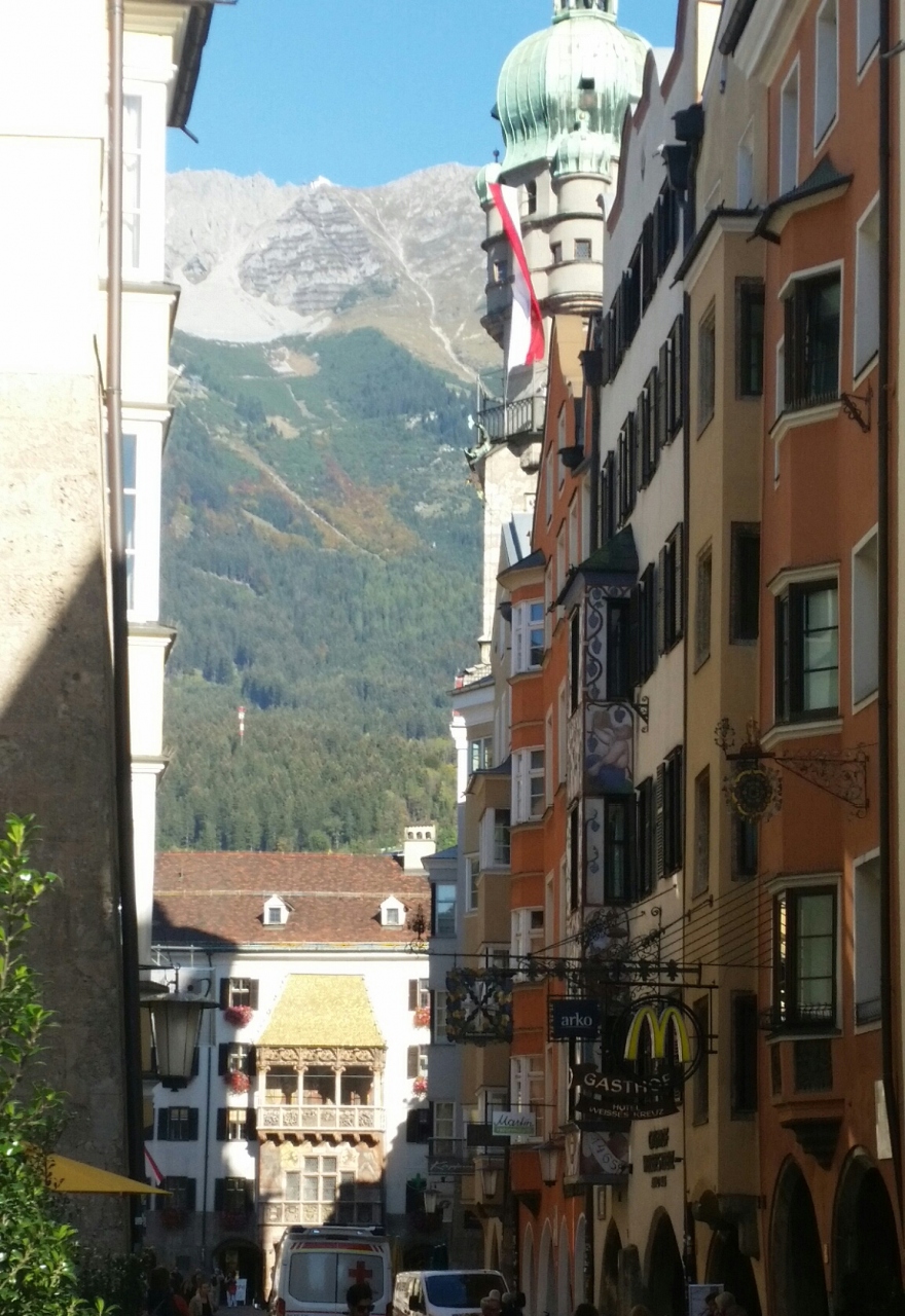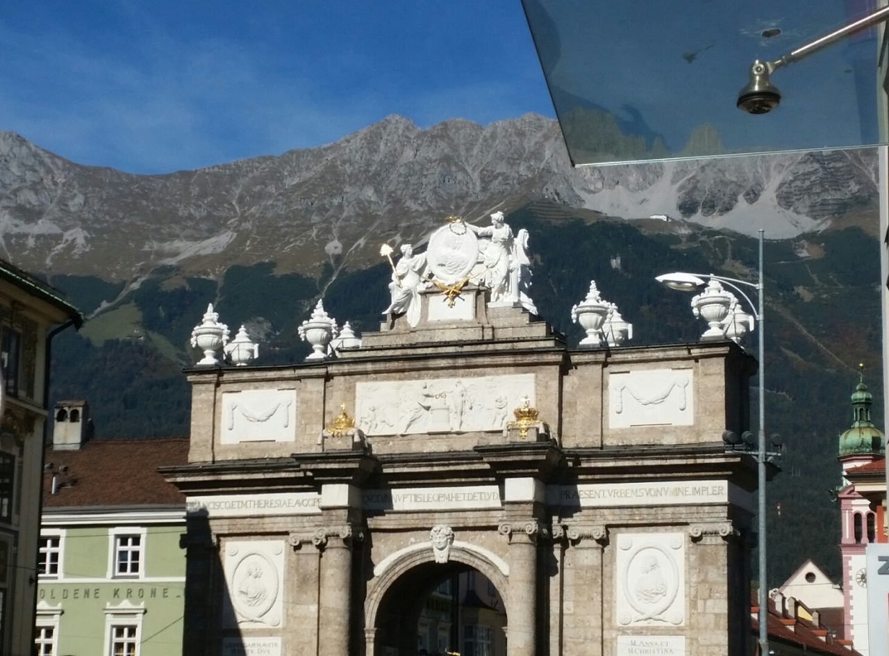 ツアーで通りました。インスブルックの目抜き通りで、両側にお店がずらりと並んでいます。大勢の観光客で大賑わいです。通りの真ん中に大理石のアンナ記念柱が立っており、目立ちます。端には凱旋門があり、そこをトラムが走っています。