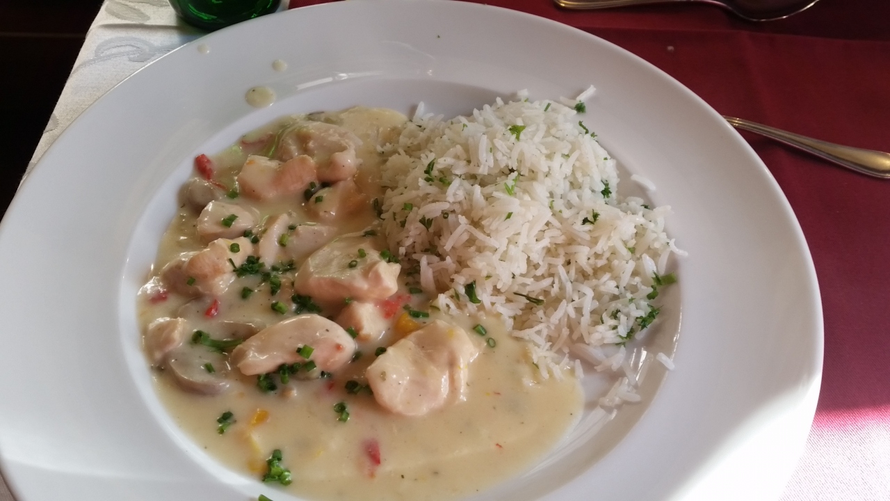 ツアーランチで訪問しました。店内にはオペラを思わせる文字と絵画が掲示されていました。メニューはサラダ、チキンとライスのプレート、バニラプディング。ライスは春雨を切ったような形でしたが、チキンクリームシチューとよく合って美味しかったです。日本人好みの味でした。