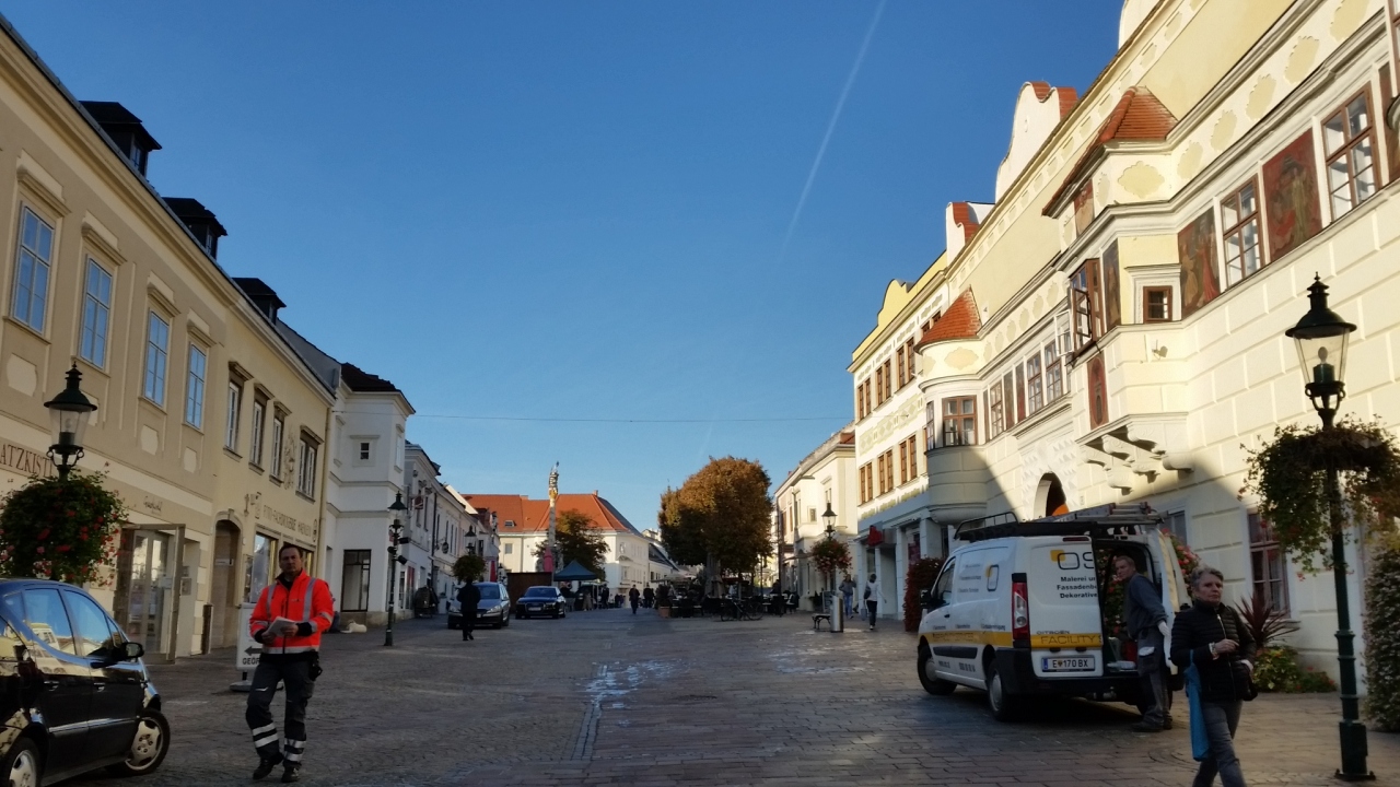 ツアーで訪問しました。石畳の通りをぶらぶらと歩いて宮殿に行きました。町のメインストリートで、金曜だったせいか、朝市が出ていました。新鮮そうな果物や野菜などを売っていて、時間があればよく見て、お買い物などしたかったです。