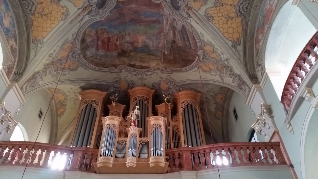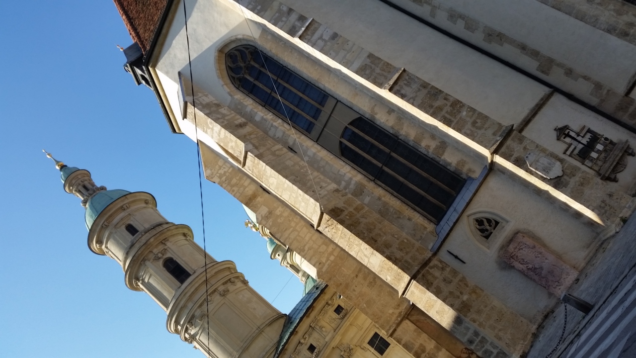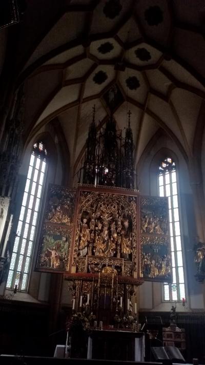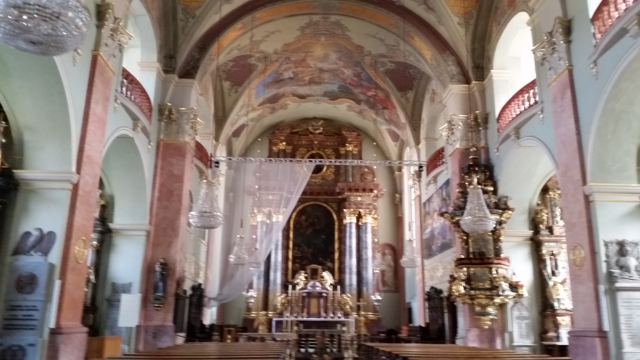 ツアーで訪問しました。町はお祭りで賑わっていましたが、教会はひっそりとしていました。高さ92mの塔と、優雅なバロック様式の内陣で知られています。ウィーン幻想派の巨匠エルンスト・フックスが約20年かけて描いた礼拝堂の、鮮やかで幻想的な壁絵が素敵です。