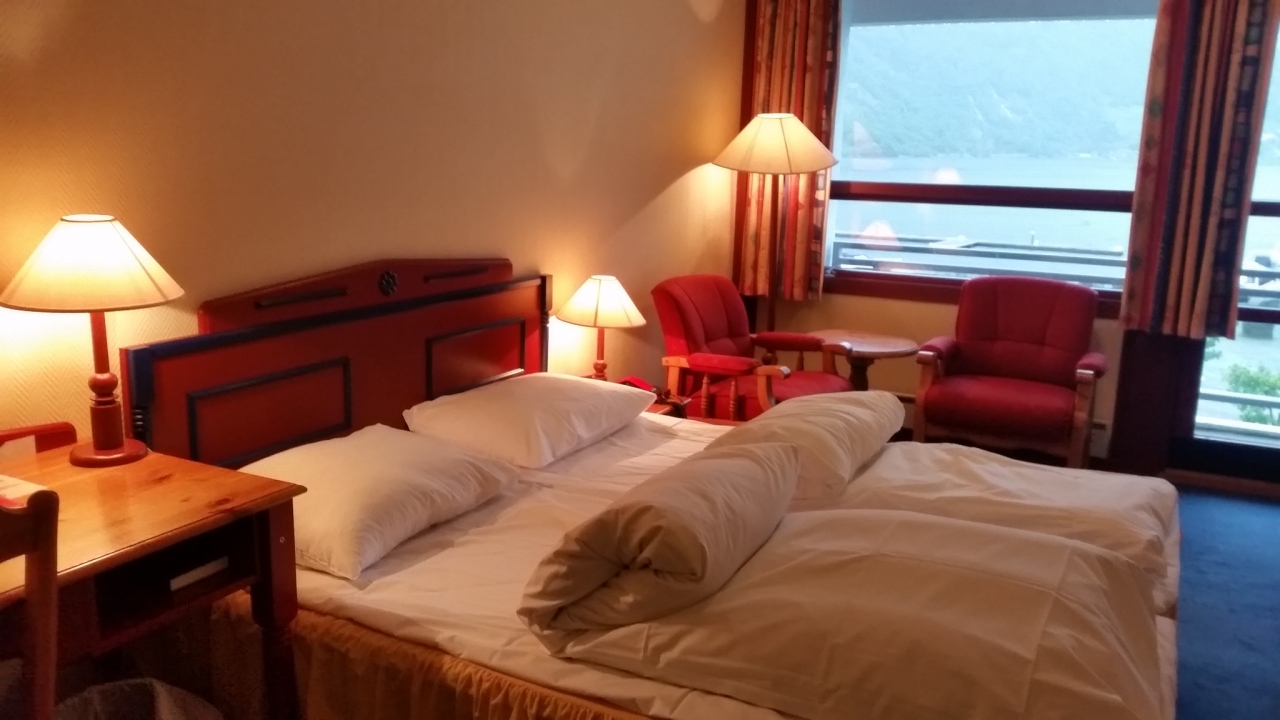 ツアーで一泊しました。港やスーパーが近いです。新館フィヨルドが見える部屋に宿泊し、眺めが良かったです。レストランなどがある旧館と5階の渡り廊下で繋がっています。夕食・朝食共に種類が多く、美味しかったです。7階ラウンジでは、夕食後、セルフでコーヒーや紅茶が楽しめました。