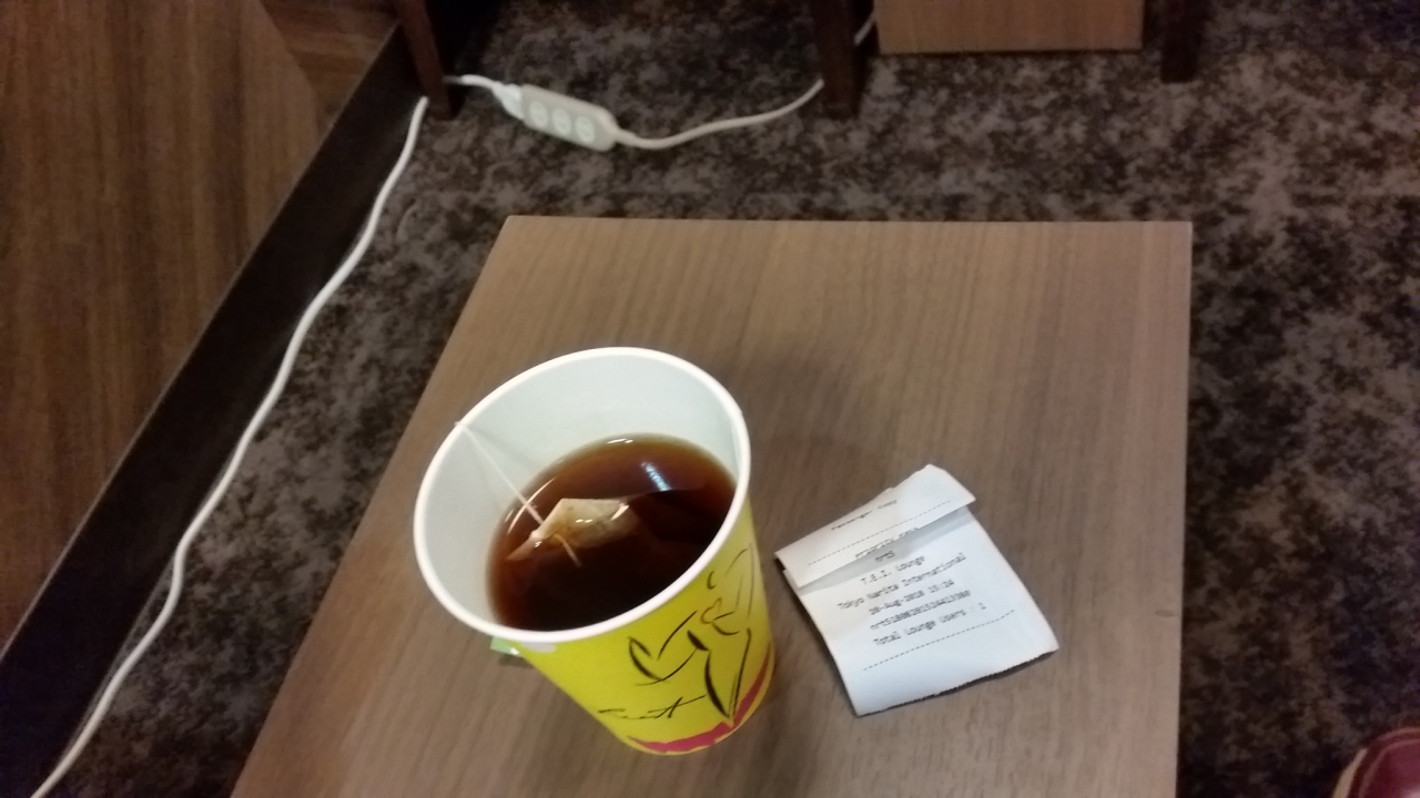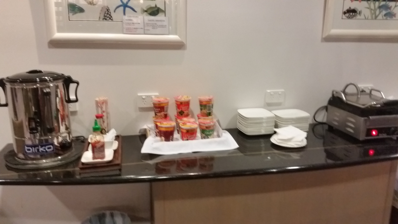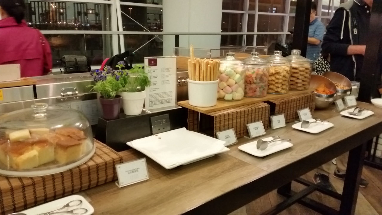 成田から香港経由で、アフリカのヨハネスブルグへ行く乗り継ぎの時間に利用しました。出発が2時間遅れたので、ゆっくりする時間はなく、20分だけ利用しました。麺類、サンドイッチ、飲み物などそこそこの物が置いてあります。お客に対して椅子の数は少ないような感じでした。