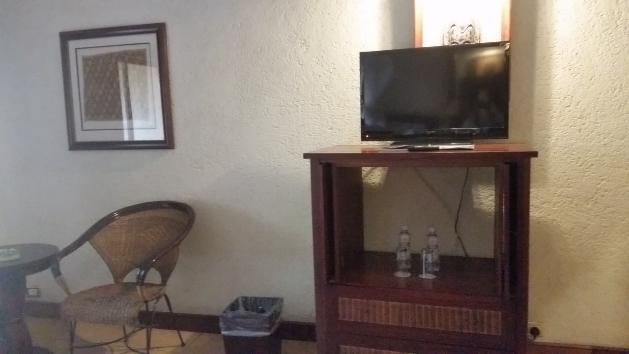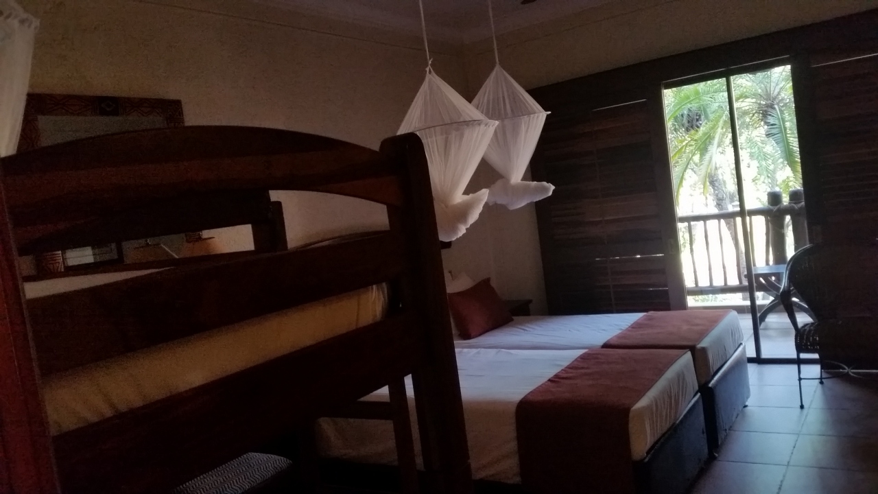ツアーで3連泊しました。ビクトリアの滝に近い大型リゾートホテルです。4ベッドのシングル利用で、各ベッドに蚊帳がありました。部屋にはミネラルウォーター2本、電気ポット、固定式シャワー、バスタブがありました。窓を開けると蚊や動物が入るとのことでしたので、虫よけは持参したものの、蚊にはさされませんでした。