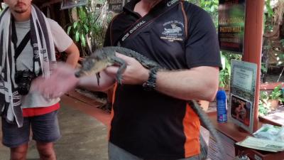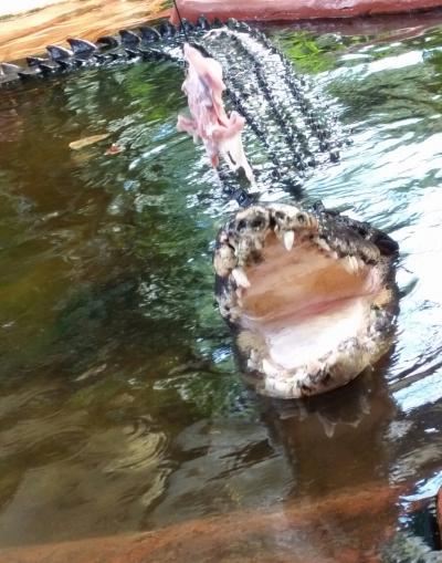 母はグラスボート、娘はシュノーケルをし、ランチ、14時に乗船するまでの時間つぶしに行きました。20豪ドル。世界最大でギネスに載っているワニ、お相手を3匹も殺したワニなど、いろいろなワニがいます。係のたくましい男性が、棒の先にターキーを括り付け、振り回すと、それにジャンプしてくらいつき、男性を引っ張るくらいの強い力で食べてしまうその様は、期待していなかっただけになおさら大迫力で、感動しました。