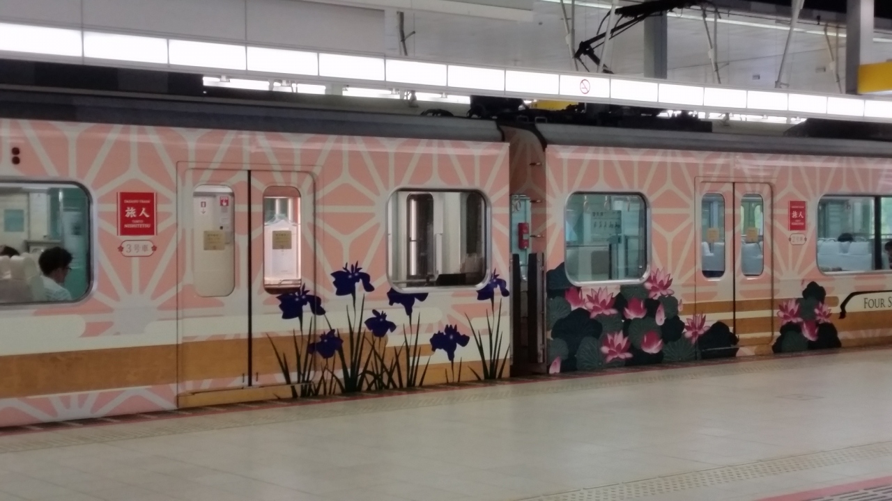 福岡天神から大宰府へ行くために乗る、西鉄電車です。ラッピングが可愛いです。座席は他のと変わりませんが、天井からいろいろとぶら下がっていて、外側から見ても、中で見上げてみても、大宰府への期待が高まります。