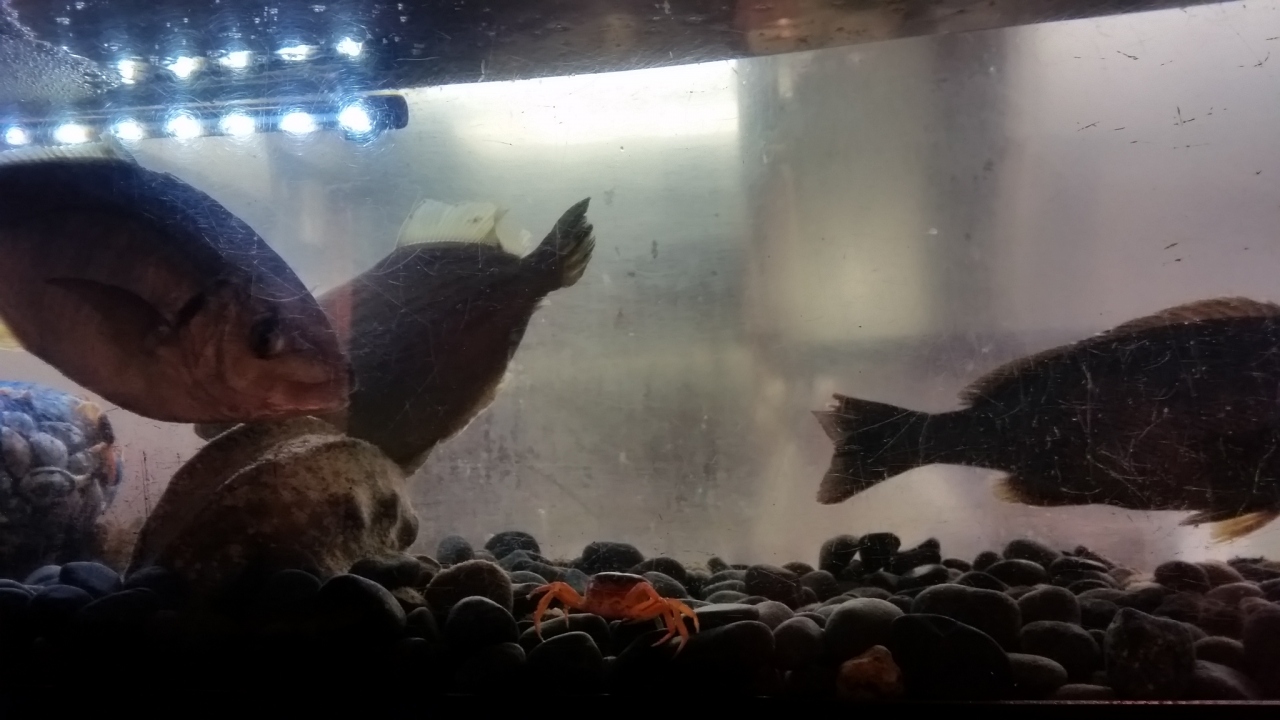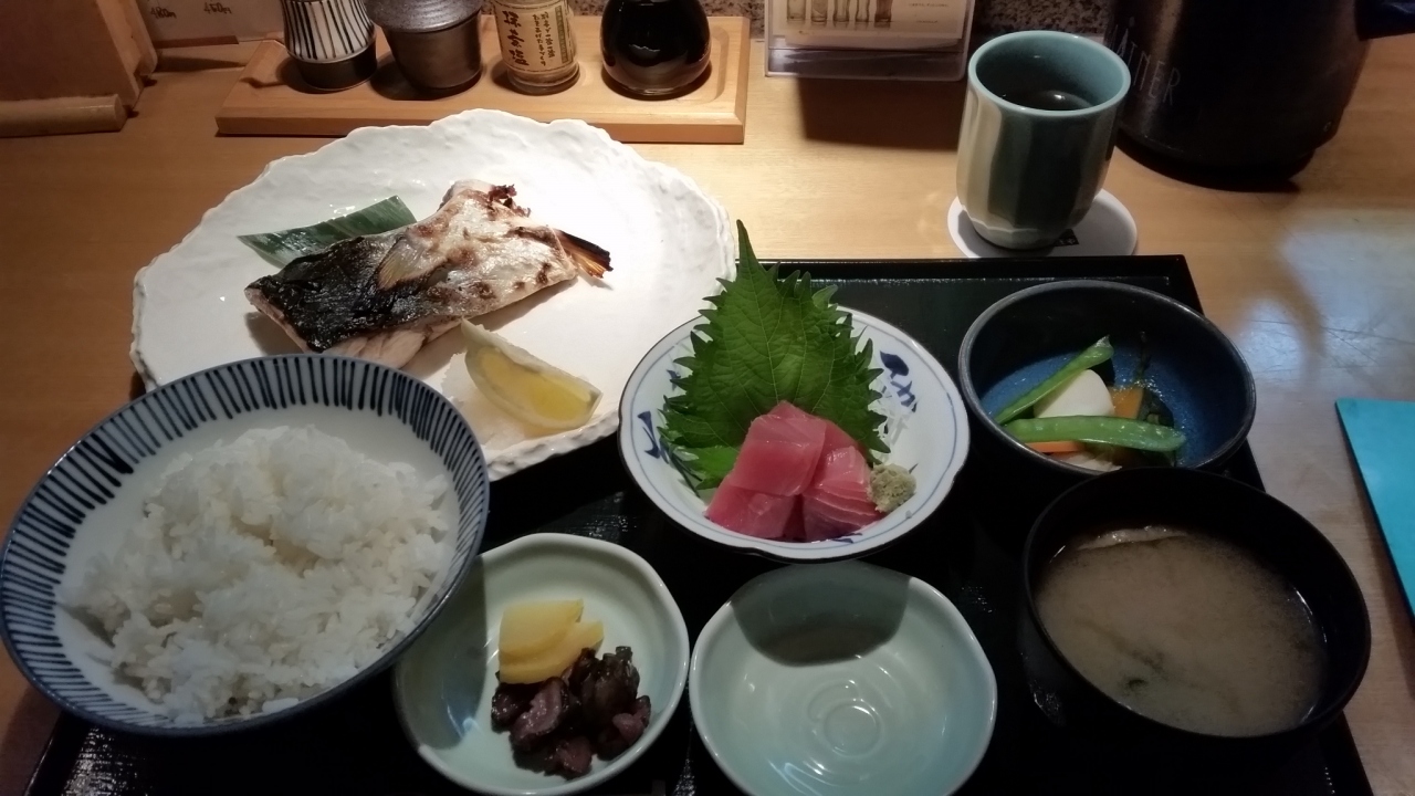 JR津田沼駅から歩道橋でつながっているパルコの6階にあります。3連休の中日のランチに訪問しました。すぐカウンター席に。焼き魚定食には鮭や鯛などいくつかから選べ、私はイナダのカマをチョイス。ごはん、みそ汁、漬物、マグロの刺身、煮物が付いて950円。水槽の中のお魚とにらめっこしながら美味しく頂きました。