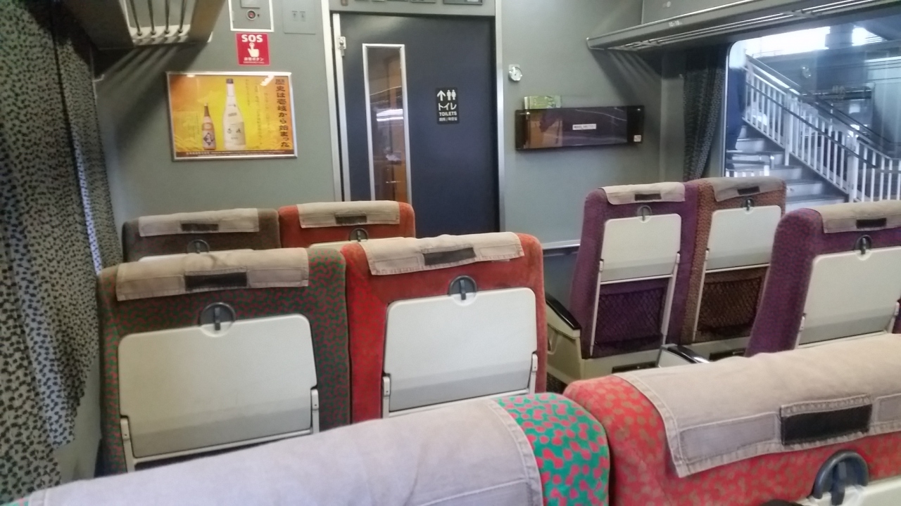 小倉から博多に向かおうと、ホテルを出ましたが「ソニック」には間に合わず、次は「きらめき」でした。ソニックなら40分ほどで博多に着きますが、きらめきは停車駅が多く1時間ほどかかります。偶然車両は「ハウステンボス号」先頭はオレンジ色の車両。車両の中央辺りが出入り口。座席もカラフルです。ソニックより空いており、確実に座れるので急がない方にはお勧めです。