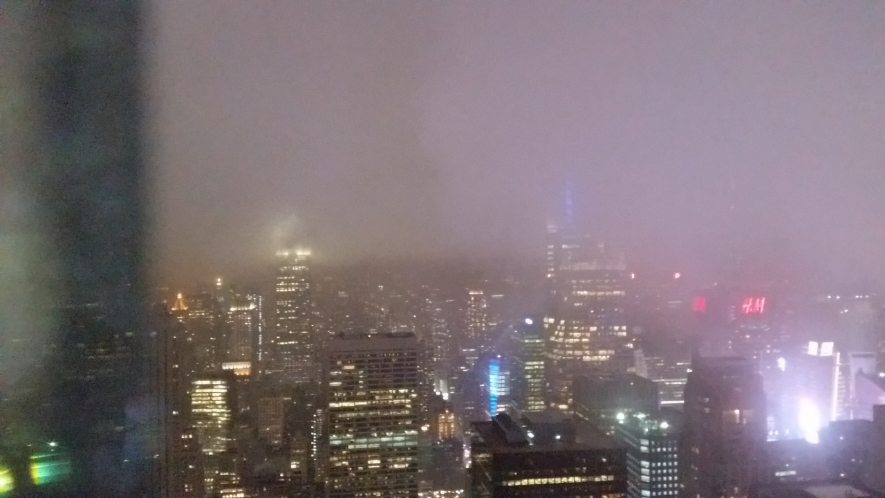 ツアーで夕食後行きました。晴れていれば、セントラルパークや、エンパイアステートビルが見えるはずでした。が、あいにくの雨で大変寒かったです。どれくらい見えるのか不安でした。サミットシャトルと呼ばれるエレベーターで一気に67階へ。その後エスカレーターで展望台へ。雨の中ぼんやりと見える青い光にあれがそうかなと思って、すぐ下りました。