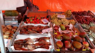 ツアーで訪問しました。店の数は多くはありませんが、地元の方達が買いに来る感じのお店が並んでいました。野菜や果物などの店が多かったです。ドライイチジクとドライデーツがそれぞれ1kg7ユーロ,8ユーロ。試食させてくれ美味しかったので300gずつ買いました。お花も一束5ユーロと安かったです。