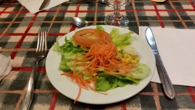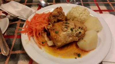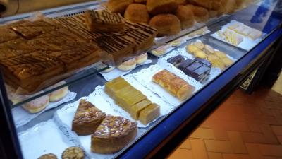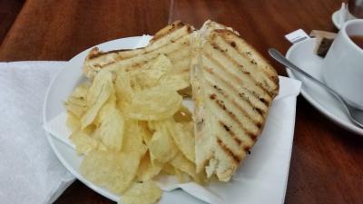 メインストリートのディレイタ通りに面しています。お昼時だったので、隣のカフェを利用しました。中に入ってメニューを見て、「ツナホットサンド」「ミルク添え紅茶」をオーダー。ツナと野菜が入っていて、ポテトチップスが付いていました。3.6ユーロ