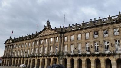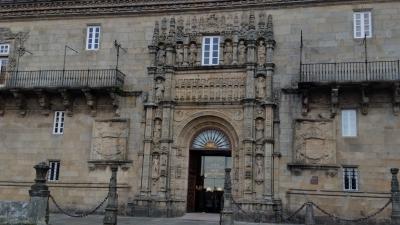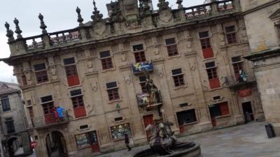ツアーで訪問しました。目の前が修復中で、青い網がかかっている大聖堂、左手にはパラドール「サンティアゴデコンポステーラ」後ろには、市役所と、歴史ある建物に囲まれた、石畳の広場です。今は冬場なので観光客はさほど多くはありませんでしたが、かつては巡礼者がここに多く集まっていたのでしょう。