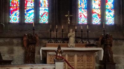 ツアーで訪問しました。巡礼者が何千kmも歩いてここを目指しました。オブラドイロ広場側はまだ修復中で青い網がかかっています。昨年度完成予定でしたが・・内部は大型香炉ボタフメイロがぶら下がっています。地下通路を降り、聖ヤコブの棺を拝んだり、ヤコブ像の後ろから抱きついたりしました。