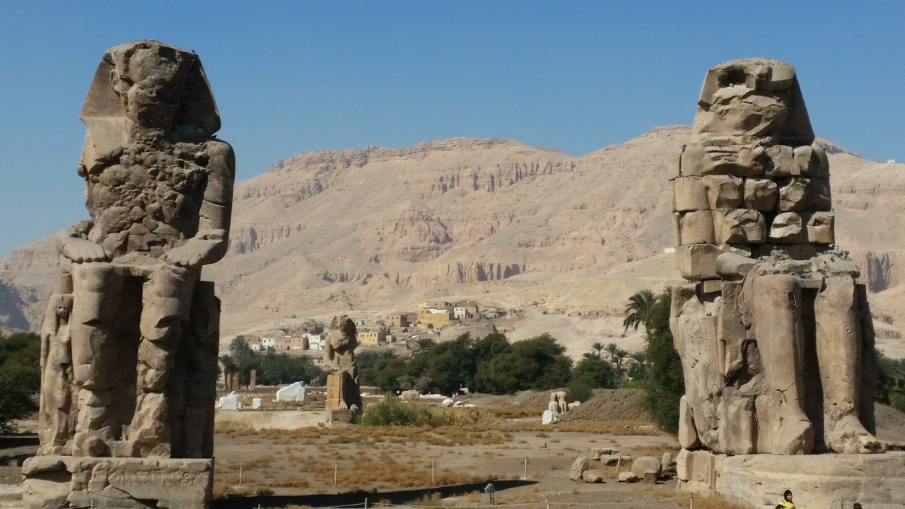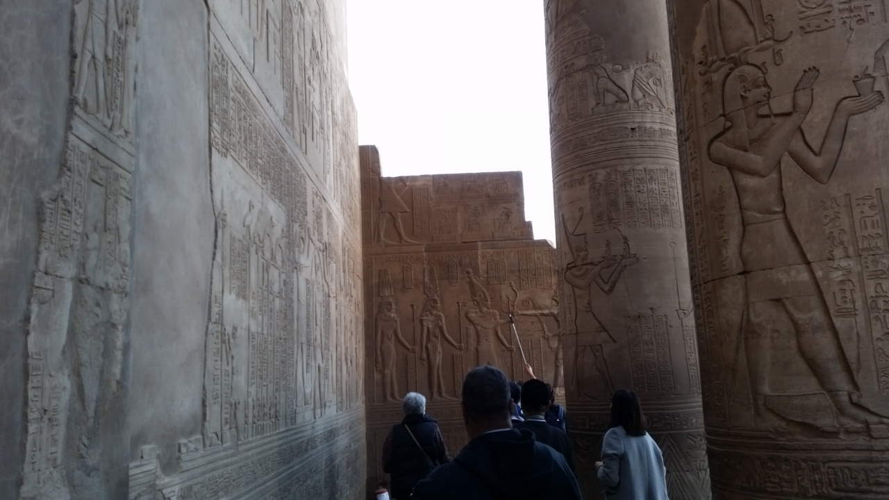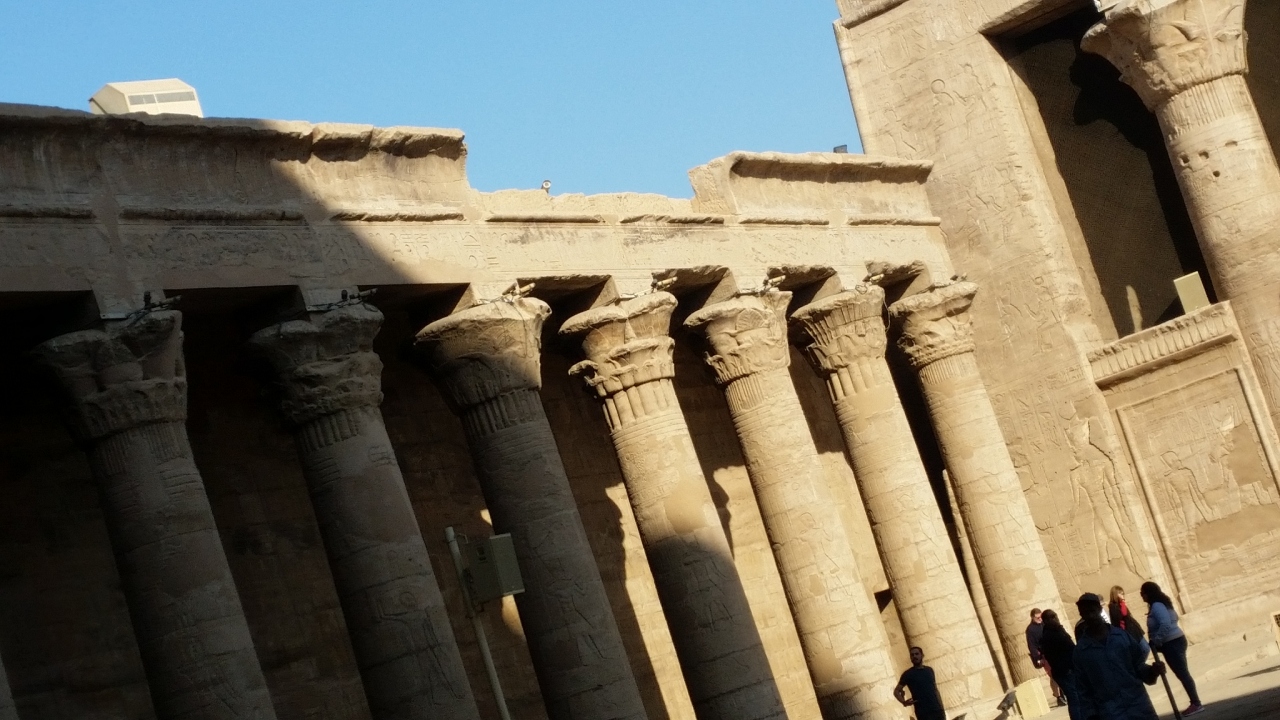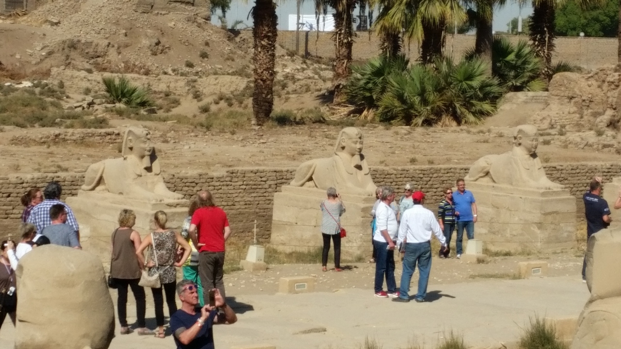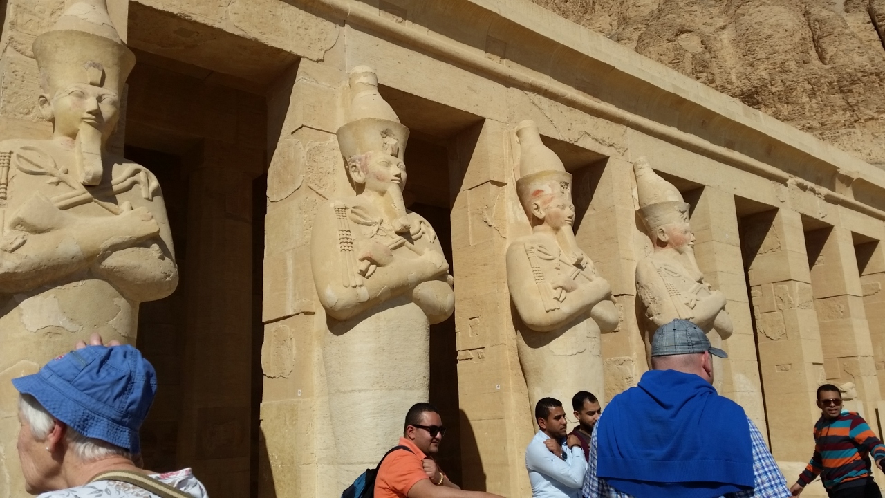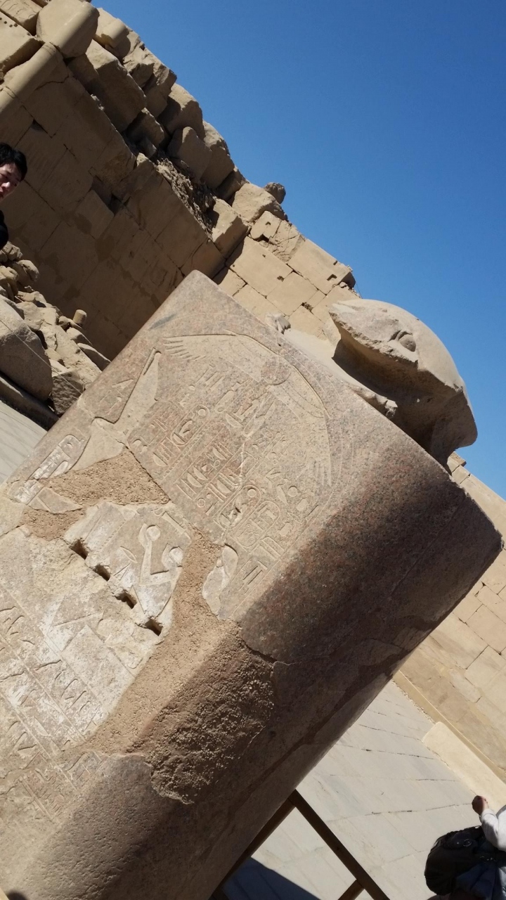 ツアーで訪問しました。片道300km3時間強かけて、ノンストップで行きました。砂漠を走り続け、ナセル湖が見えてきて、緑も見えました。写真で見たのと同じ像。でも、人がそばに行くと、大きさが全く違う。ラムセス2世が妻のネフェルタリのために造った物で、彼と彼女と子供がいて、ほんわかしました。