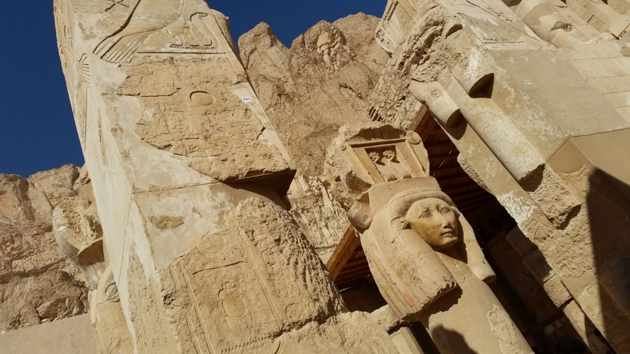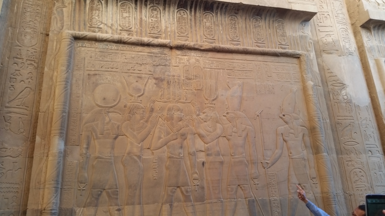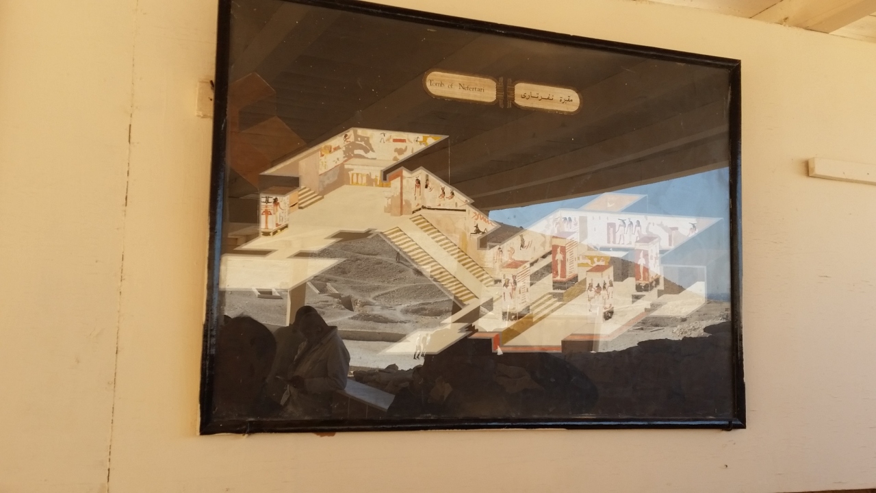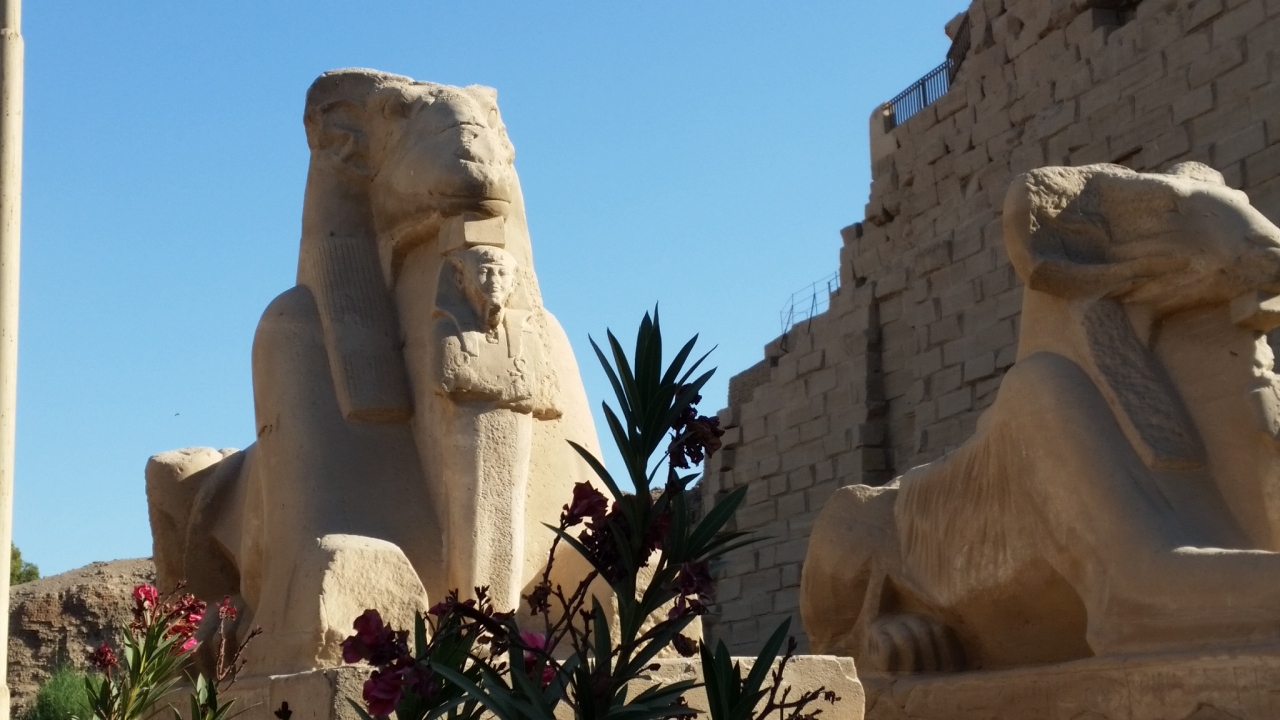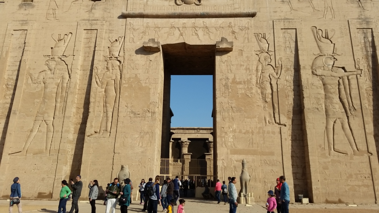 ツアーで訪問しました。片道300km3時間強かけて、ノンストップで行きました。砂漠を走り続け、ナセル湖が見えてきて、緑も見えました。写真で見たのと同じ像。でも、人がそばに行くと、大きさが全く違う。ラムセス2世が妻のネフェルタリのために造った物で、彼と彼女と子供がいて、ほんわかしました。