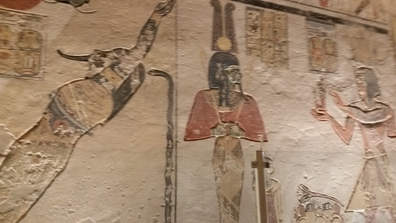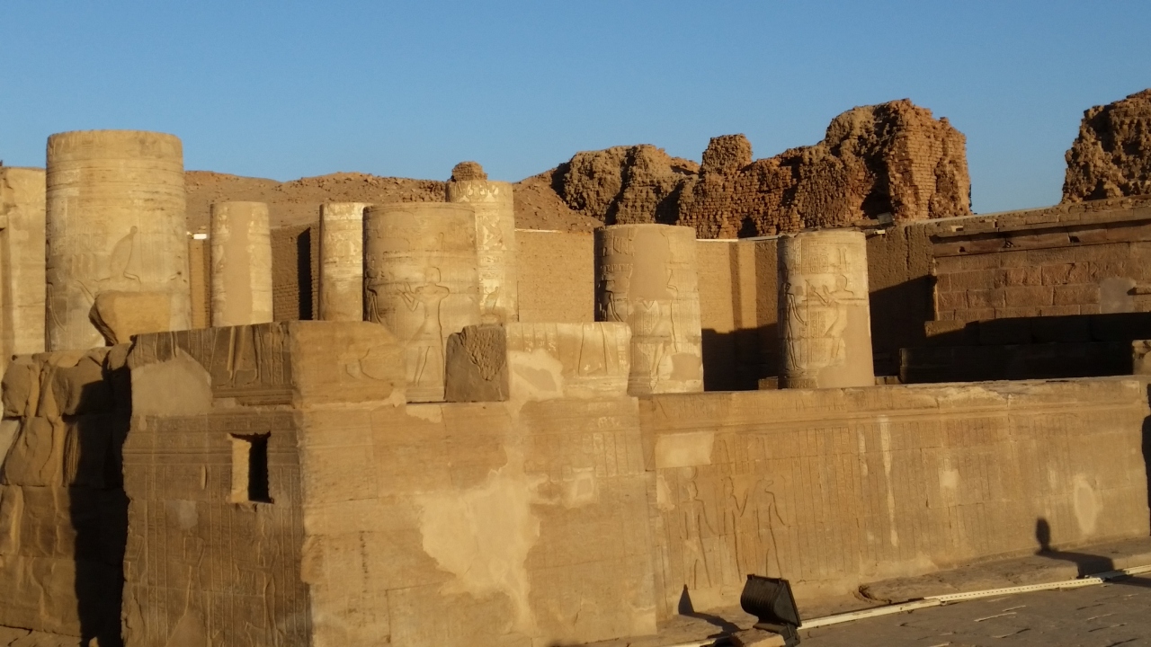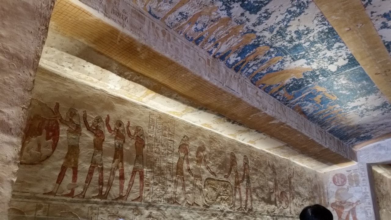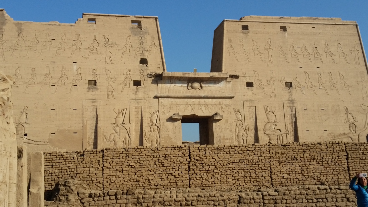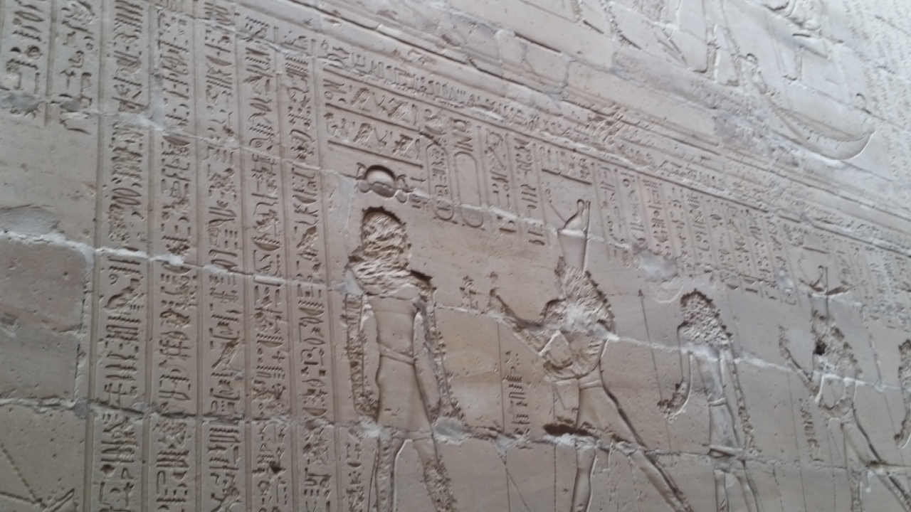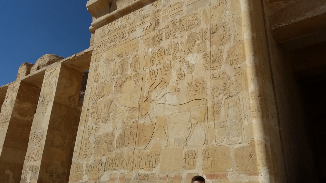 ツアーで訪問しました。片道300km3時間強かけて、ノンストップで行きました。砂漠を走り続け、ナセル湖が見えてきて、緑も見えました。写真で見たのと同じ像。でも、人がそばに行くと、大きさが全く違う。ラムセス2世が妻のネフェルタリのために造った物で、彼と彼女と子供がいて、ほんわかしました。