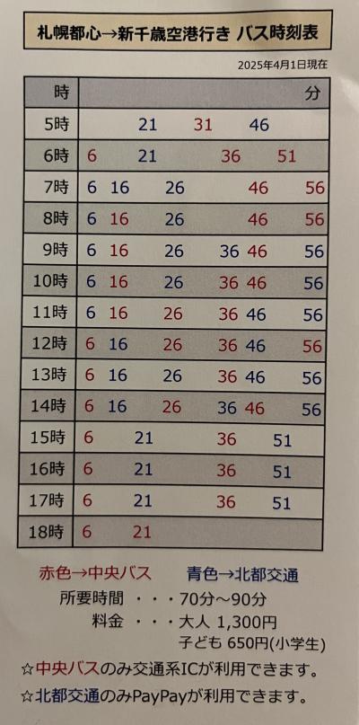新千歳空港から札幌新都心まで往復利用しました。回数券は往復で2500円で、片道ずつだと1300円なので100円お得です。行きは北海道中央バス、帰りは北斗交通のバスでしたが、回数券は共通です。ほぼ10分間隔で運行されており、乗り換えもなく、荷物もトランクに預け、座って行けるので便利です。行きは昼前だったので、待たずに乗れ80分。帰りは朝で、2本積み残され、25分待ちとなり、その他に100分かかりました。インバウンドの方の利用が多いです。