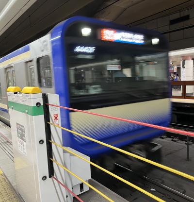 ジェットスターで成田に着きました。第3ターミナルです。出発も帰着も遅れたので、乗りたかったリムジンバスに間に合わず、1時間待ち。それなら第2ターミナルからJRに乗ろうと、ひたすら歩きました。屋根はあるものの、遠く暑い。空港内循環のバスはありますが、JR発車時刻が迫っているので、歩いた方が確実。ようやく着いて、地下に潜ります。正式名は「空港第2ビル駅」。「成田空港」と言う駅名もあるので、大変紛らわしいです。上りも下りも同じホームなので、こちらで良いのか迷いました。成田エクスプレスも止まります。ロープが上下して、それがホームガードと同じ役割を果たします。JR総武線に乗車。ここは空いていますが、次第に混んで来ます。