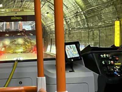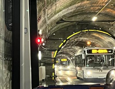 ツアーで大観峰から室堂迄往復利用しました。今年からトロリーバスではなく、電気バスに変わりました。立山室堂2450mと大観峰2316mを結ぶ3.7kmで、10分トンネルを走ります。走行はすべてトンネルで、途中で停まってすれ違いがあったり、青い光の黒部ダム工事の最難関地区の破水帯を通ったりと楽しめます。また、車内では画像が流れ、その説明もありそれも楽しめます。