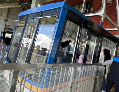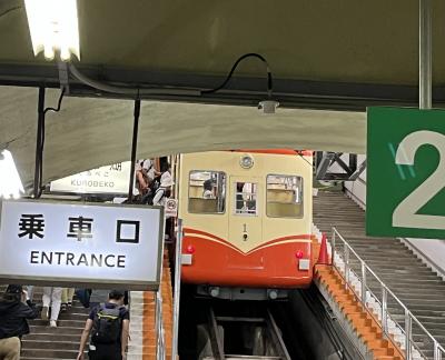 ツアーで、黒部湖駅から黒部平まで往復利用しました。黒部湖駅からし黒部平駅までは、0.8km約5分の旅です。標高差400m、最大勾配31度の急斜面を走ります。自然景観保護と雪崩などの危険を回避のための構造で、日本で唯一の全線地下式ケーブルカーです。 昭和44年開業時から一度も車両を更新せず、開業当時のままの客車なので、レトロ感を感じます。ここも来た順に6列に横並びの整列乗車で、改札を通ると、急こう配の階段を上って乗車しました。