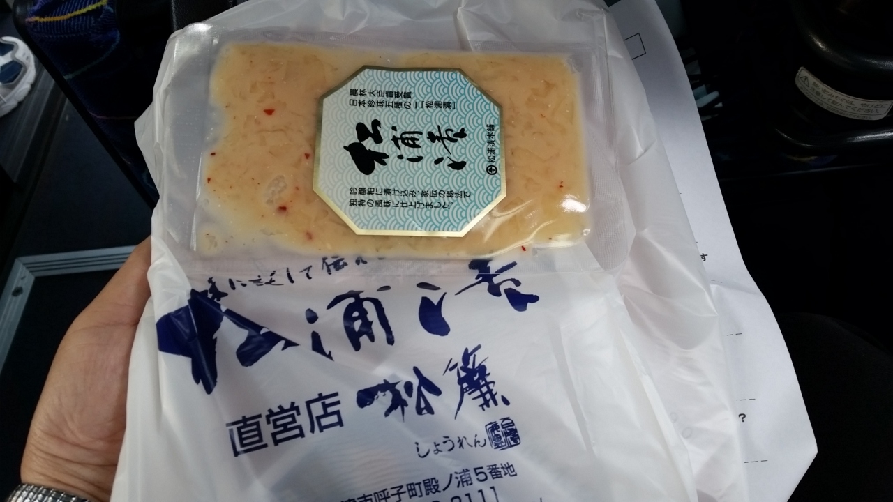 日帰りバスツアー最後に訪問しました。クジラのあごの骨を酒粕で漬け込んだものです。観光バス1台48人が入るとお店は見動きできません。まずは試食。こりこりとした食感です。ただ、私は奈良漬けでも酔っぱらうくらいで、アルコールは苦手なので、お茶で流し込んだ感があります。お好きな方は、お酒のおともに、ご飯のおかずに、良いのではないでしょうか?