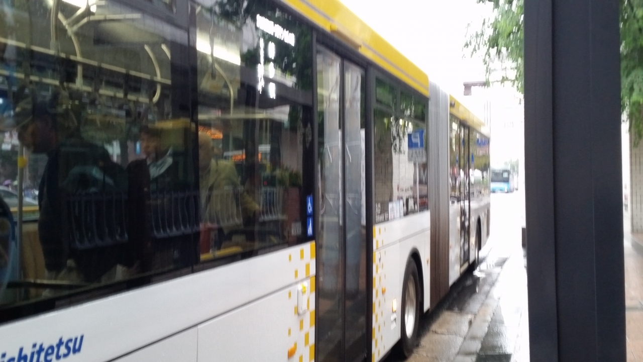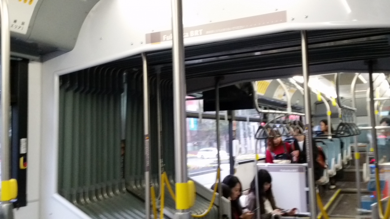 天神から博多駅までなが~いバス走っているので一度乗ってみたいと思っていました。数台やり過ごし、乗りました。スイカがあれば、後ろから乗り降りできるようです。私は後ろから乗り、景色を見たかったので前から降りました。座席は横向きと前向きとありました。楽しかったです。