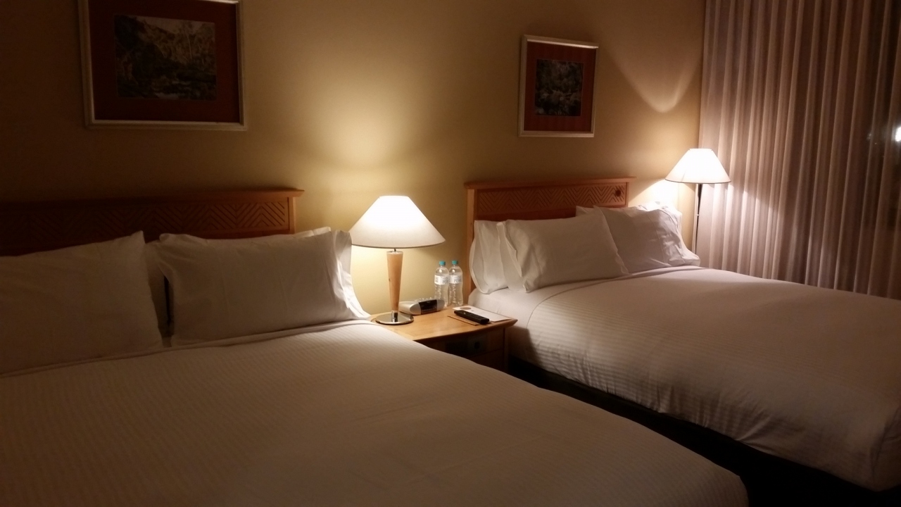 ツアーで3連泊しました。部屋にはダブルベッドが二つ。固定式シャワーブースとバスタブがあります。いつでもお湯が出ます。排水は遅めです。アイロンとアイロン台、テレビ、ドライヤーがあります。会員はベッドサイドの水は無料です。朝食はブッフェ。フルーツが沢山あり、自分でフレッシュジュースを絞って作って飲むことができます。クロワッサンが美味しいです。斜め前にコンビニ、徒歩3分の所に小さめのスーパーがあり、便利です。