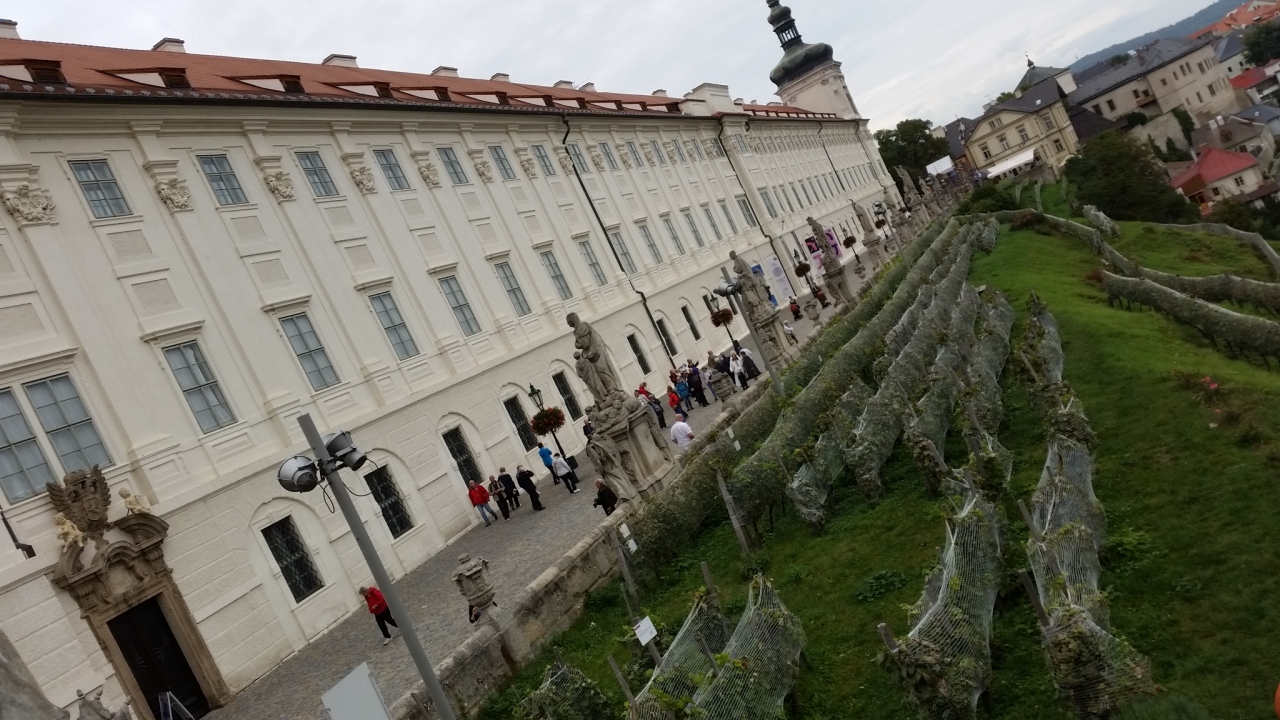 ツアーで訪問しました。バスを降りて、石畳の街を少し歩いてまずランチ。その後中央ボヘミヤ地方美術館を覗き、聖バルバラ教会とイタリアンコートを見学しました。斜面にブドウ畑、通路にカレル橋のような彫刻群、そして形の変わった教会と、中世のヨーロッパの雰囲気をじっくり味わいました。