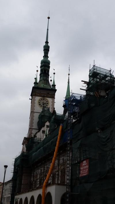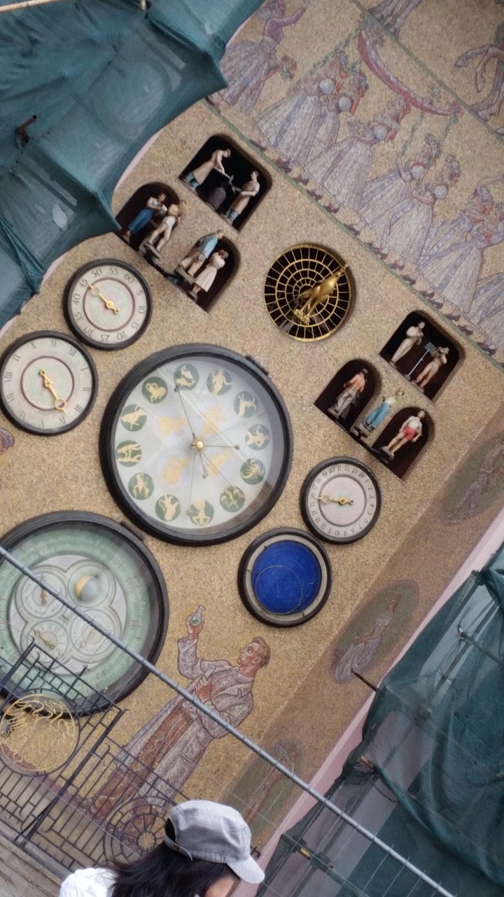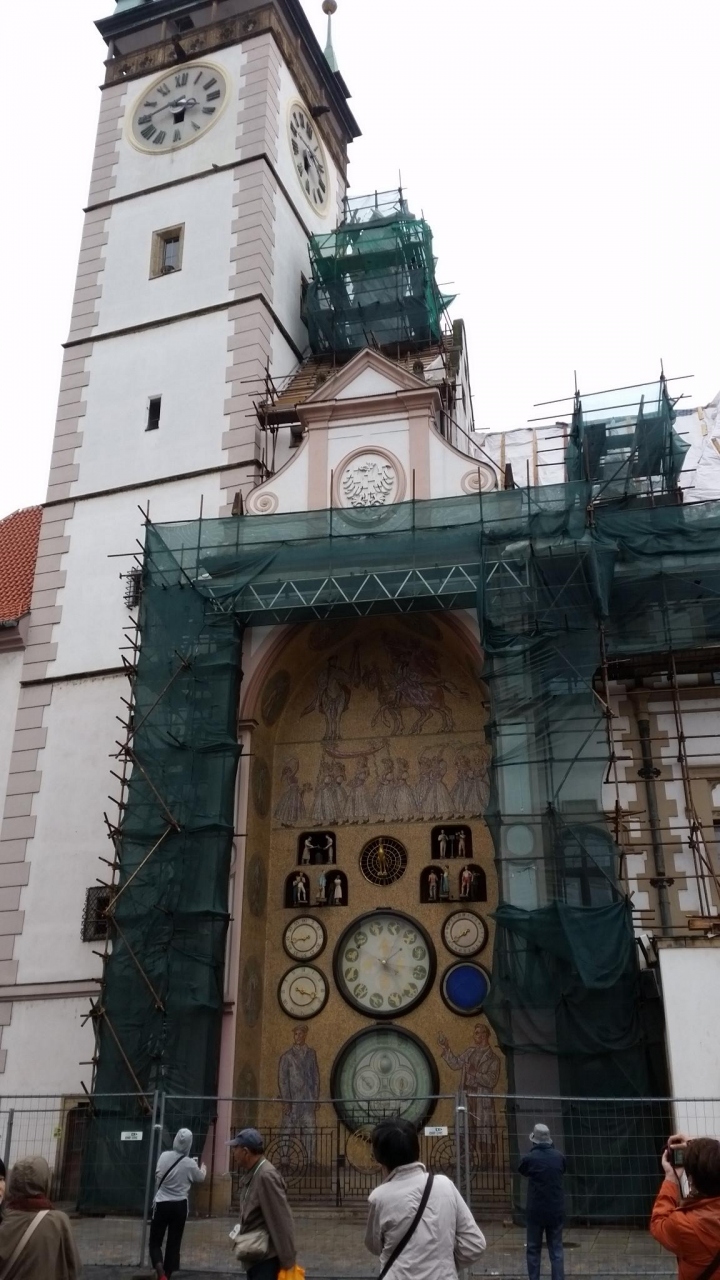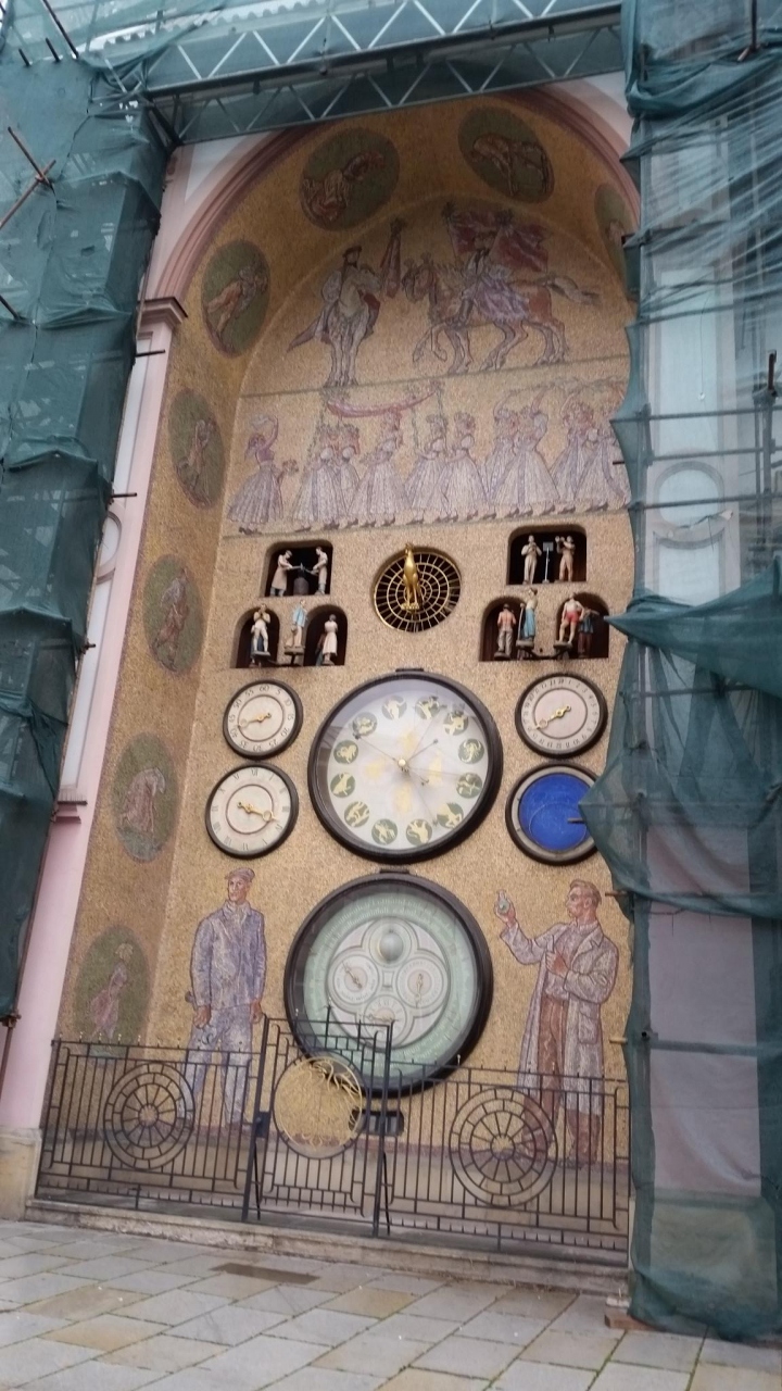 ツアーで訪問しました。市庁舎は工事中でしたが、この時計はカバーもかけられず、見ることができました。塔の基壇の所にあるのがこの時計です。金色で文字盤のある時計と、からくり人形が付いています。動きは微妙です。