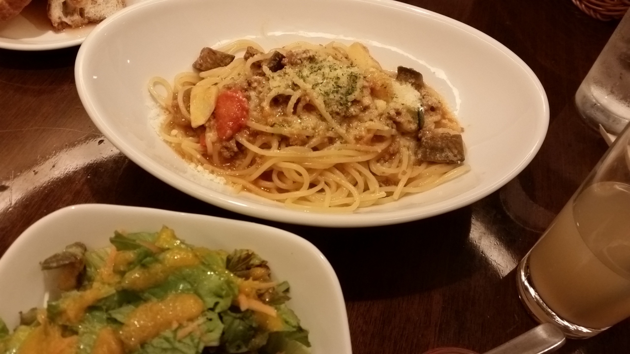 山種美術館の帰り、恵比寿駅まで戻ってランチしました。恵比寿駅の目の前の地下1階です。私はカルボナーラ風+ミートソース風÷2と言ったものをチョイス。パンとソフトドリンクはフリー、サラダと、水曜はレディースデーで一口ケーキがついて、980円でお得でした。