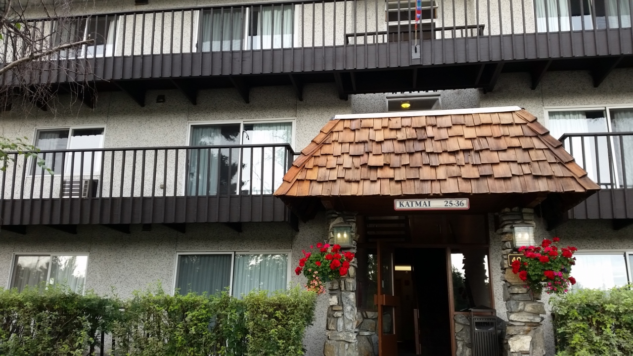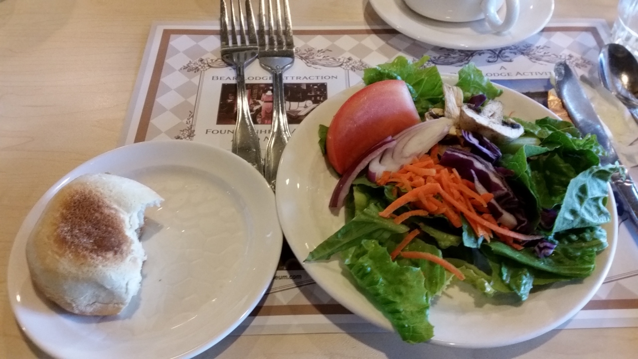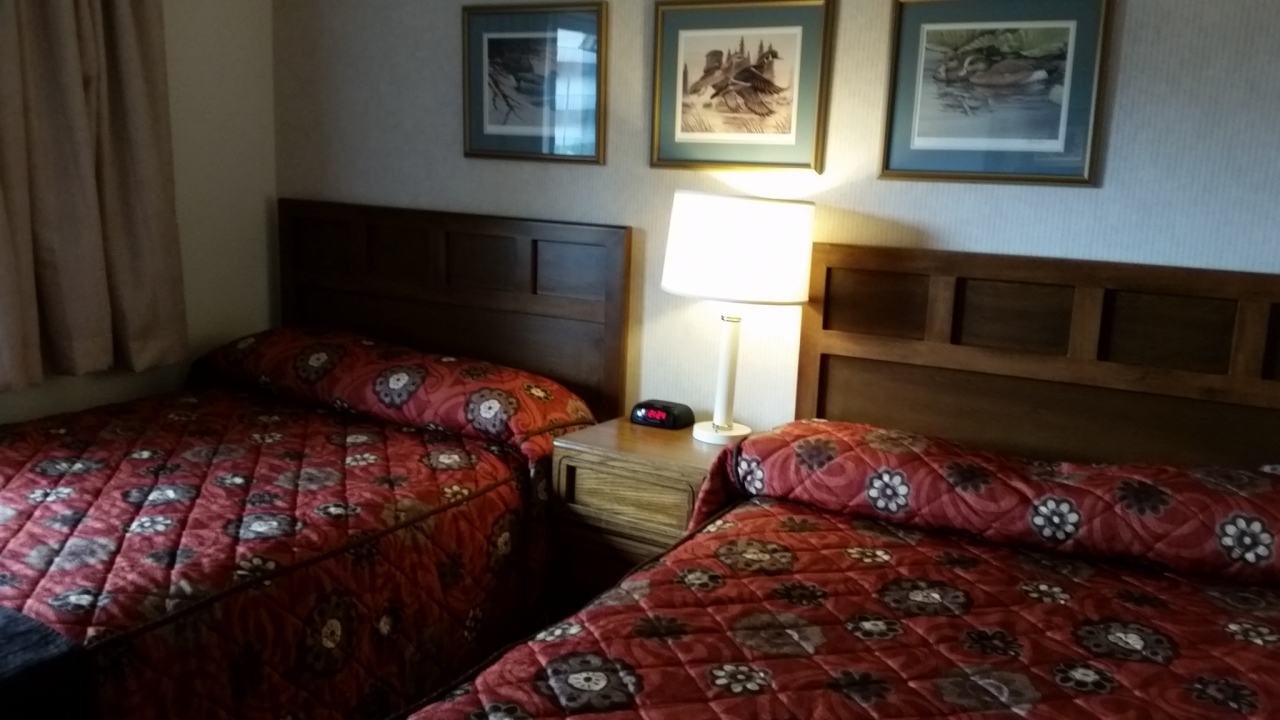 ツアーで1泊しました。部屋は丸太小屋風の造りで、ベッド、シャワー、コーヒーメーカーなど必要な物はそろっています。電話はないのでモーニングコールはなし。5階だったので、レストランやフロントが戸外の木の階段を上り下りしなくてはならず、遠かったです。夕食のステーキはとてもおいしかったです。朝食はいくつかから選べました。