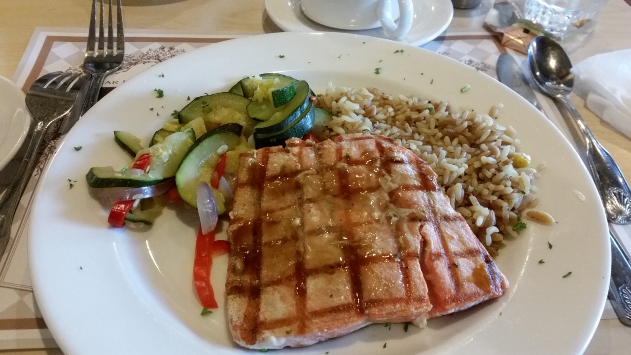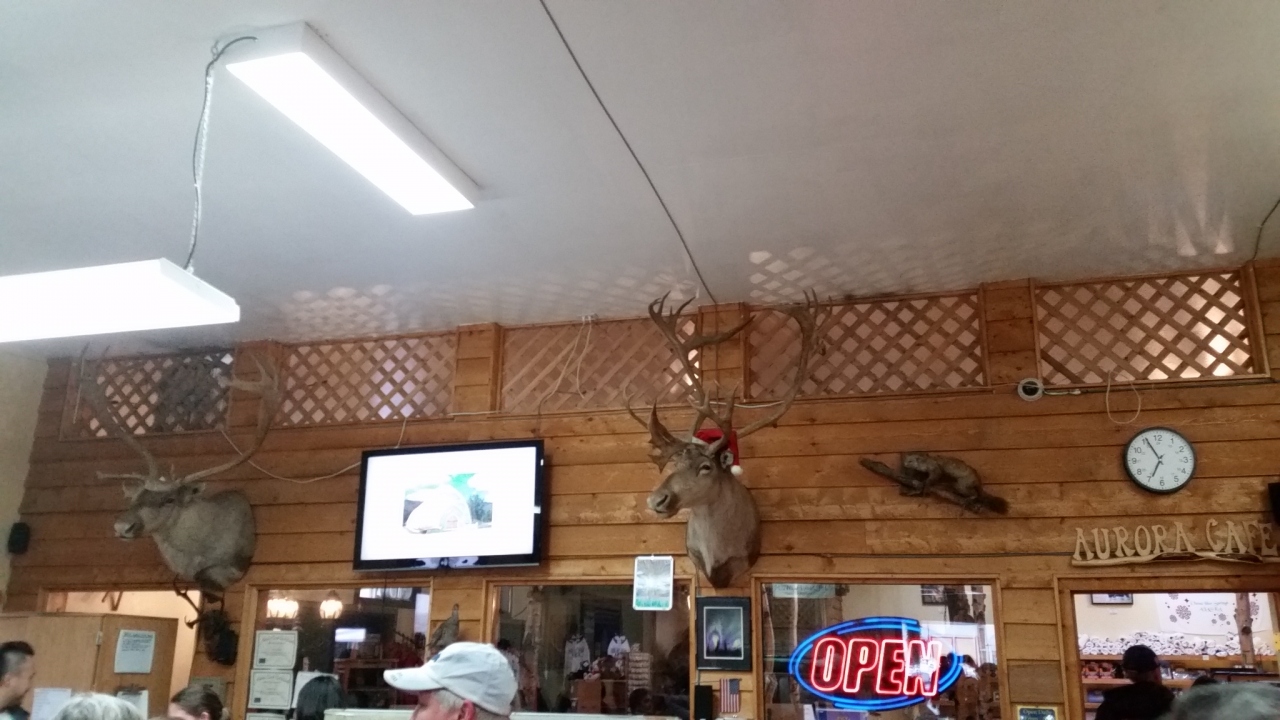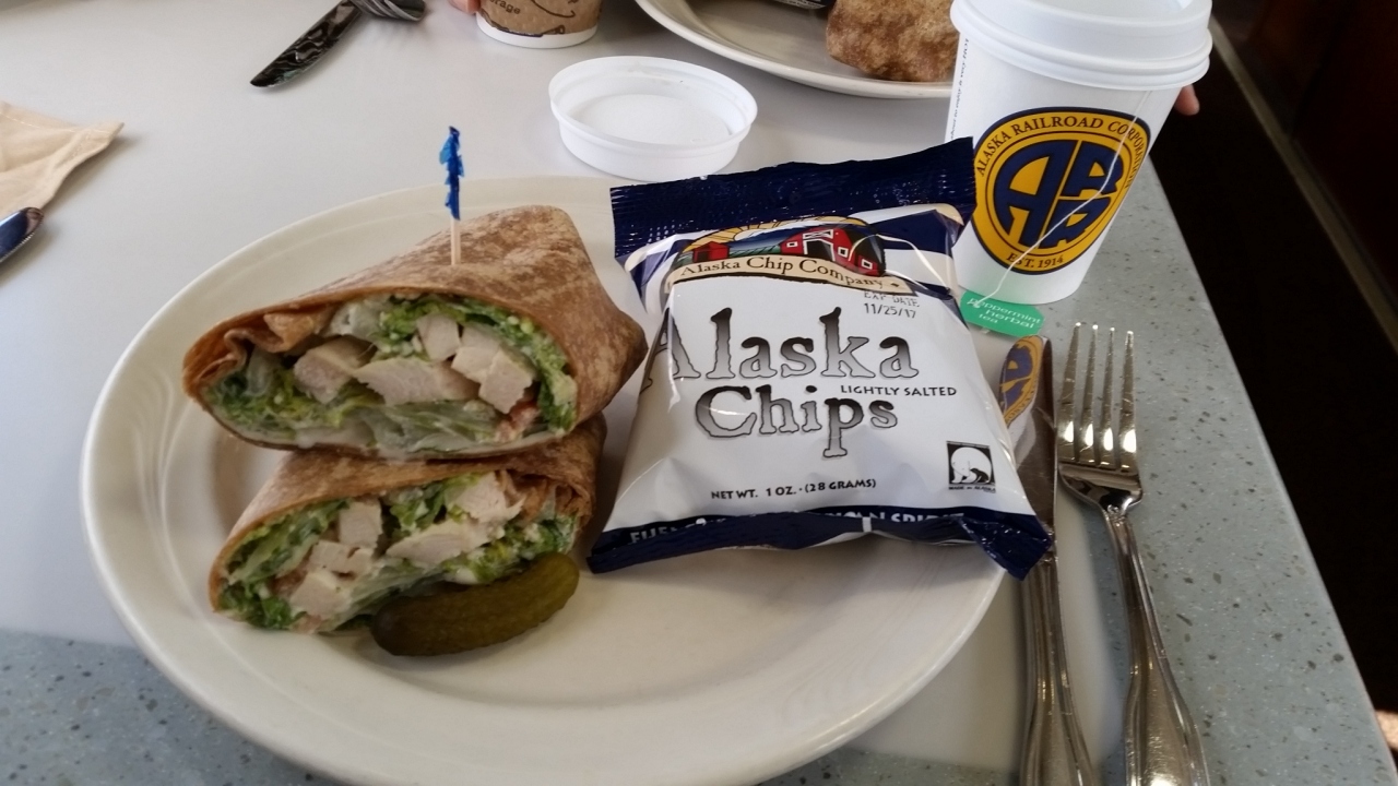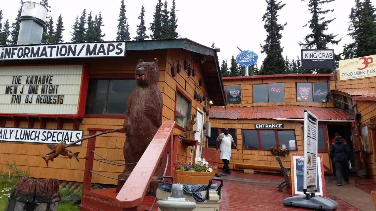 ツアーのランチで訪問しました。デナリ国立公園バスツアーにこの後行くので、近くのお店ということらしく、ツアーバスが出発する場所の道路を挟んで向かいにあるお店です。白身魚のフライ、ポテト、コールスローサラダ。サラダは完食、他のはこってりし過ぎて残しました。飲み物は「コーヒーか紅茶か、コーヒーサーバー壊れてるけど」という面白い選択でした。そう言われなくてもいつものように紅茶をチョイス。