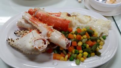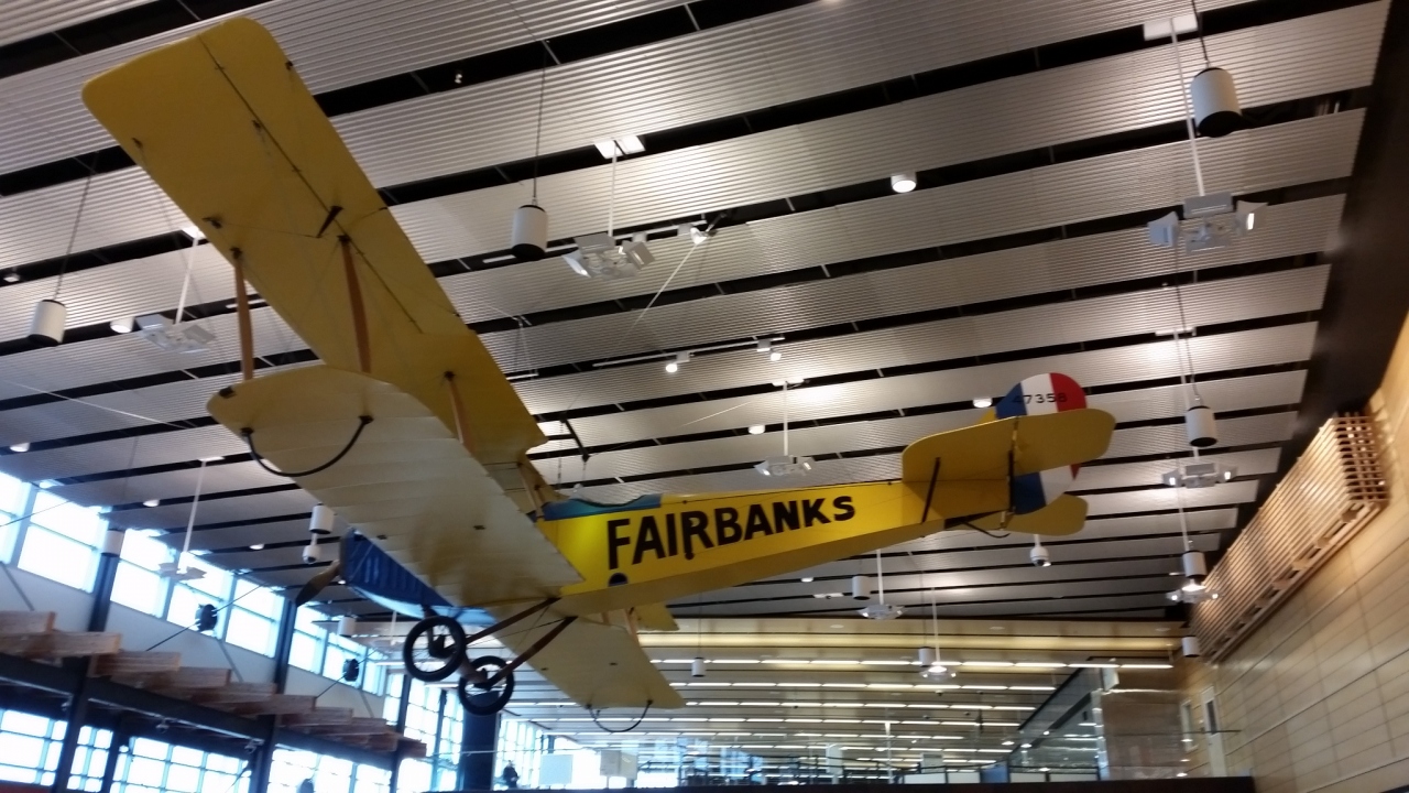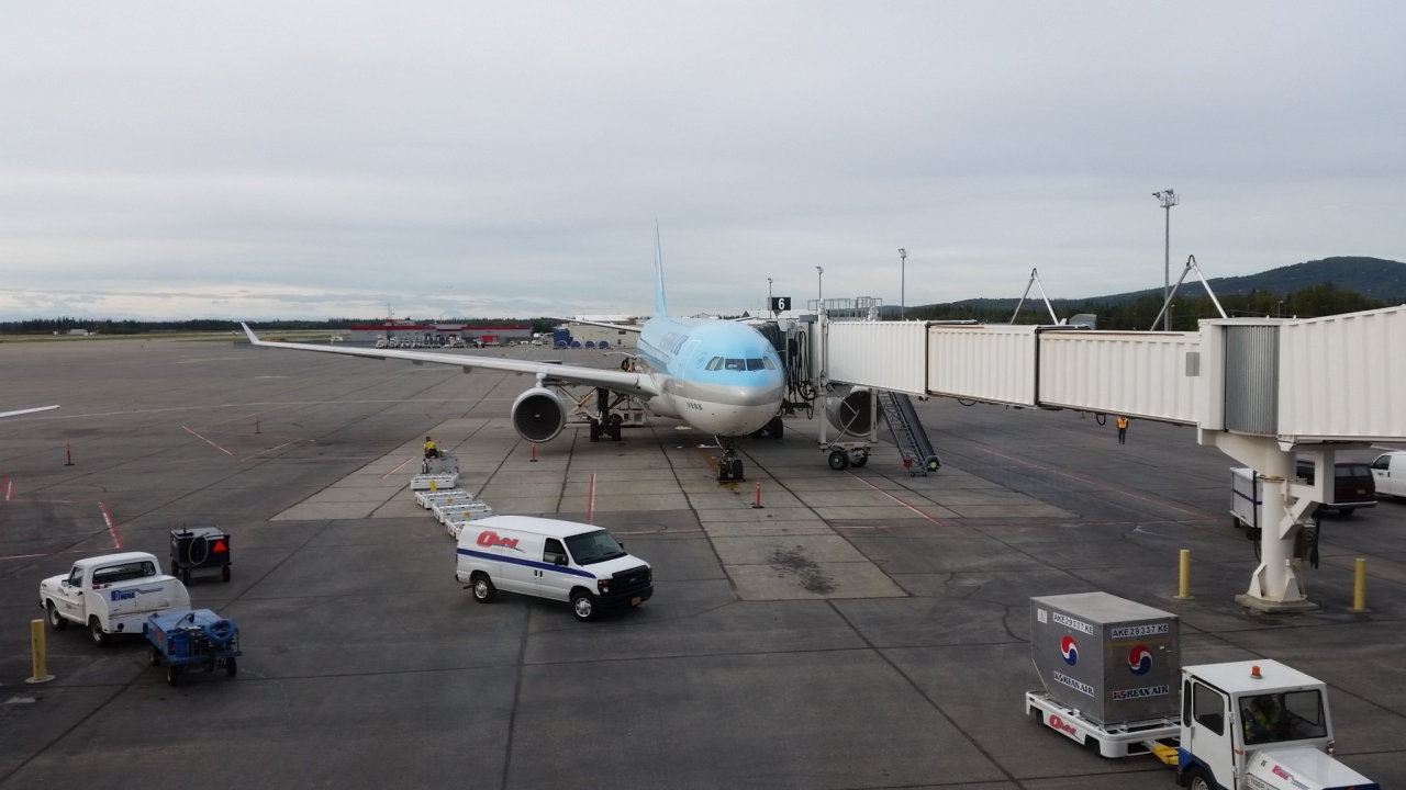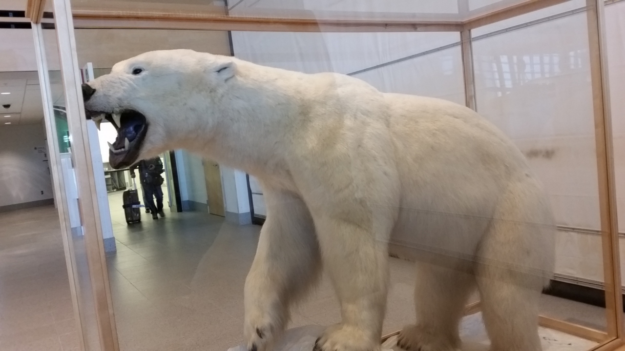成田からツアーで、大韓航空のチャーター便で訪問しました。国際便の空港としては、小さい感じがしました。イミグレを抜けるまで、合計2時間待ちました。抜けるとまずは白熊君がお出迎え。アラスカに来た感じがしました。