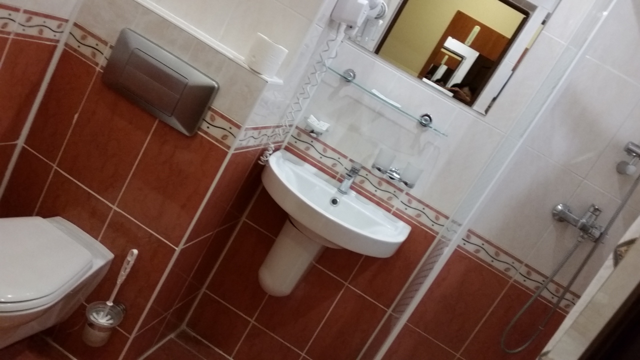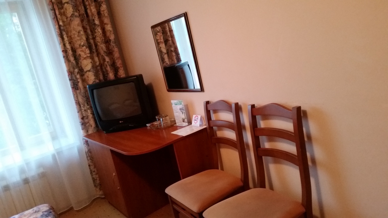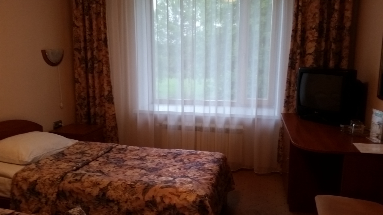ツアーで1泊しました。田舎町に一軒だけあるホテルという感じで、横に長いつくりです。WIFIはロビーのみ。部屋にはシャワーしかなく、ポット、ティッシュ、ごみ箱もありません。水のタンクは廊下にありました。食事は普通に美味しかったです。1階の売店のお姉さんが親切で、マトリョーシカやピアス等まとめて買うと、少し負けてくれました。エルミタージュ美術館で750ルーブルで買ったマトリョーシカのピンブローチが、ここでは100ルーブルで、大変お得でした。