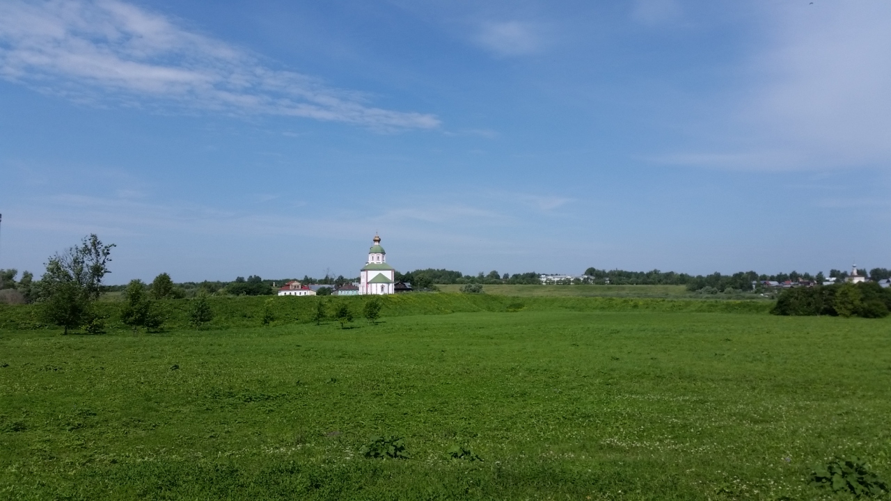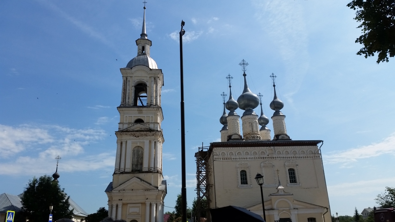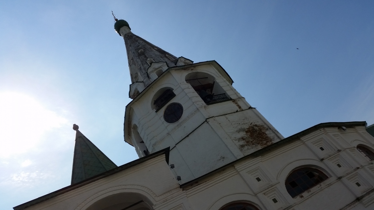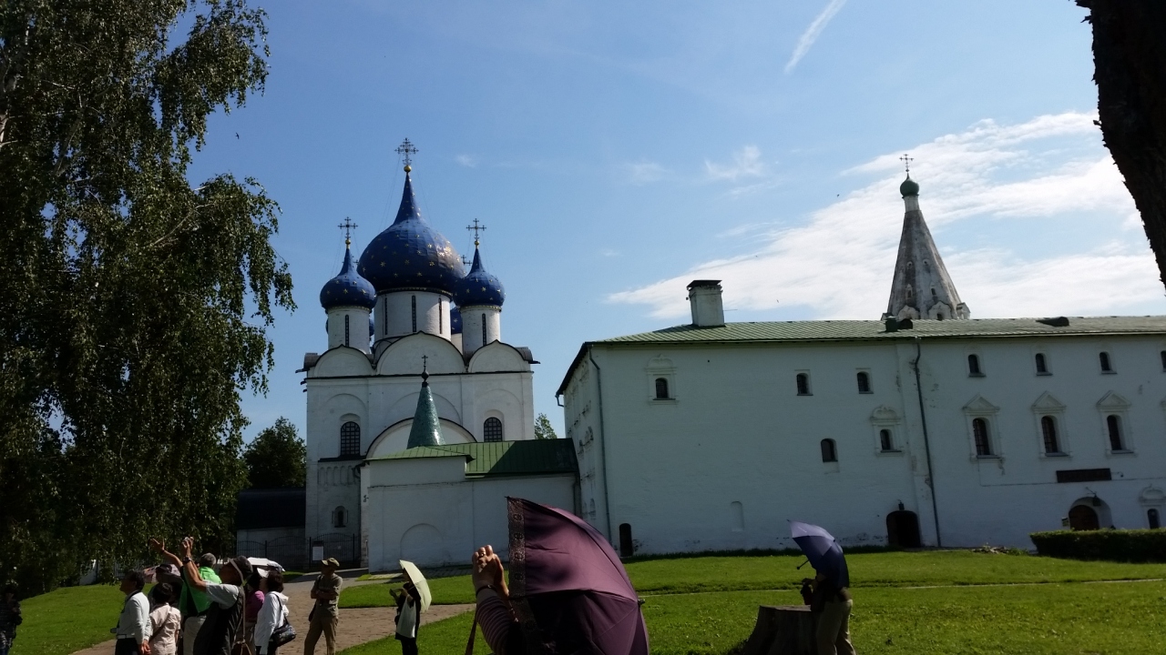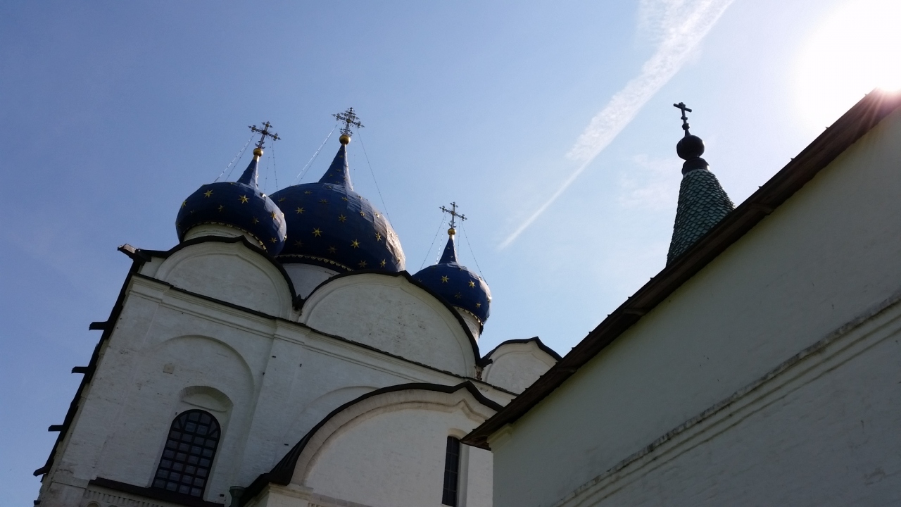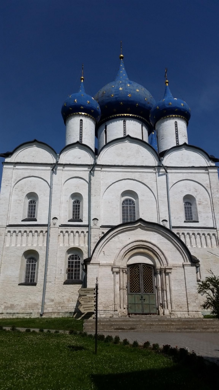 ツアーで訪問しました。スーズダリで最も古い建築で、13世紀に建てられました。下部は白い石灰岩で建てられ、浮き彫りが施されており、上部は、16世紀に建て直されています。近くで見ると青い玉ねぎ頭に金色の星がちりばめられています。