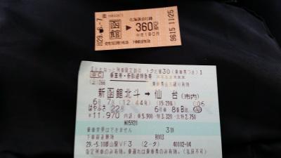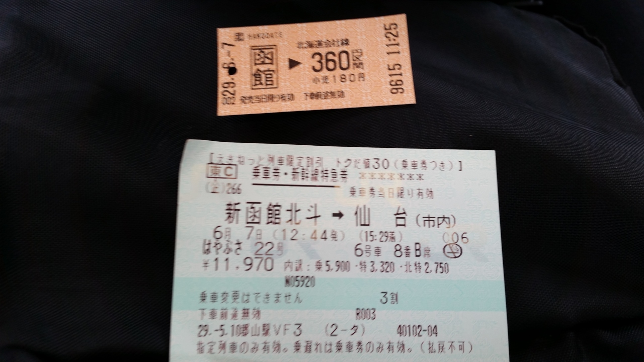 友達3人で新函館北斗から仙台まで利用しました。1か月前に予約していたので、3割引きで11970円。3割引と聞くとお得感満載ですが、早くLCC予約すると函館~仙台はもっと安いはずです。車体に紫色のラインがあると「北海道」新幹線。座席は横に3-2。床絨毯は雪の模様。青函トンネルは25分もかかります。12:44発で15:29着ですから2時間半強で着きます。車内でのコーヒーはSサイズで320円です。話のネタに1度は乗ってみるのもよいですが、あなたはどちらを選びますか?