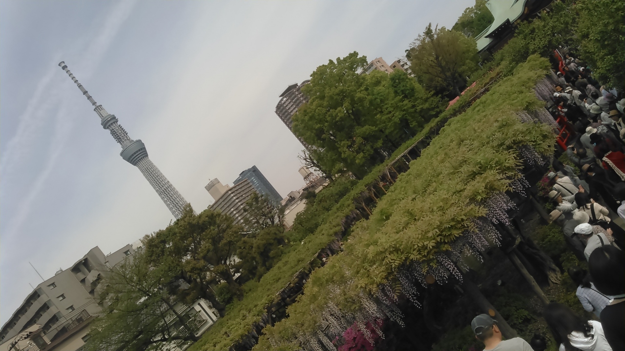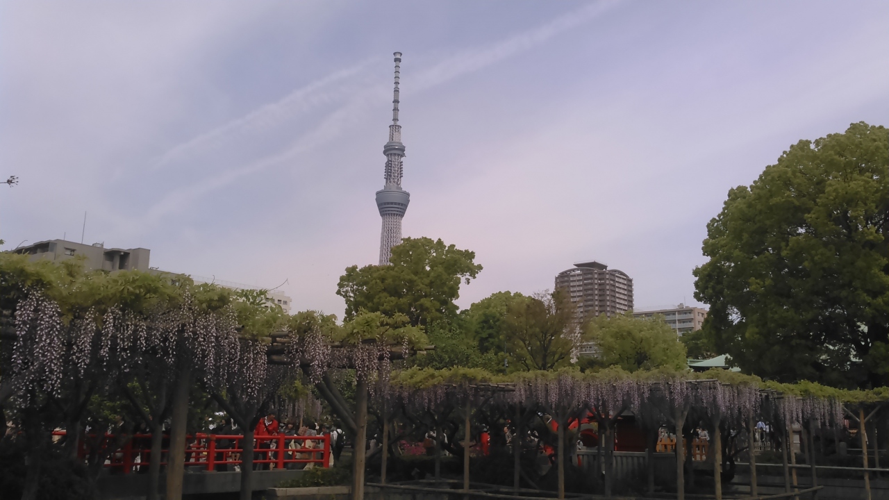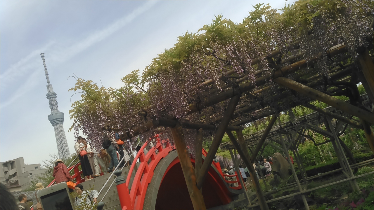 日帰りバスツアーで訪問しました。朝9時頃着きましたが、もう、大勢の方が見頃の藤の写真を撮っていました。周りには屋台が沢山出ていました。藤は本殿に向かって左側が沢山咲いています。スカイツリーも撮ろうと思ったら、右側から撮ることをお勧めします。赤い太鼓橋とスカイツリーと藤が撮れます。